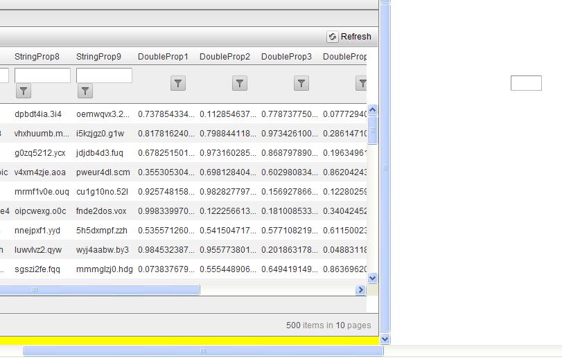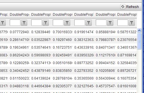 <telerik:RadGrid ID="RadGrid1" EnableViewState="true" Height="97%" runat="server" AutoGenerateColumns="False" AllowFilteringByColumn="True" AllowSorting="True" CellSpacing="0" ShowGroupPanel="True" OnNeedDataSource="RadGrid1_NeedDataSource" AllowMultiRowSelection="True" AllowPaging="True" PagerStyle-AlwaysVisible="true" PageSize="50"OnItemCreated="RadGrid1_ItemCreated"> <ClientSettings> <Selecting AllowRowSelect="True" /> <Scrolling AllowScroll="True" UseStaticHeaders="True" /> </ClientSettings> <MasterTableView CommandItemDisplay="Top"> <CommandItemSettings ShowAddNewRecordButton="False" /> <Columns> <telerik:GridBoundColumn DataField="Code" HeaderStyle-Width="75px" FilterControlAltText="Filter Code column" HeaderText="Code" SortExpression="Code" UniqueName="Code"> </telerik:GridBoundColumn> <telerik:GridCheckBoxColumn DataField="Item" HeaderStyle-Width="75px" DataType="System.Boolean" FilterControlAltText="Filter Item column" HeaderText="Item" SortExpression="Item" UniqueName="Item"> </telerik:GridCheckBoxColumn> <telerik:GridTemplateColumn DataField="Title" HeaderStyle-Width="200px" HeaderText="Title" Groupable="false" SortExpression="Title" UniqueName="Title"> <ItemTemplate><asp:label ID="TitleLabel" runat="server" Text='<%# Eval("Title") %>'></asp:label> </ItemTemplate> </telerik:GridTemplateColumn> <telerik:GridBoundColumn DataField="StringProp1" HeaderStyle-Width="75px" FilterControlAltText="Filter StringProp1 column" HeaderText="StringProp1" SortExpression="StringProp1" UniqueName="StringProp1"> </telerik:GridBoundColumn> <telerik:GridBoundColumn DataField="StringProp2" HeaderStyle-Width="75px" FilterControlAltText="Filter StringProp2 column" HeaderText="StringProp2" SortExpression="StringProp2" UniqueName="StringProp2"> </telerik:GridBoundColumn> <telerik:GridBoundColumn DataField="StringProp3" HeaderStyle-Width="75px" FilterControlAltText="Filter StringProp3 column" HeaderText="StringProp3" SortExpression="StringProp3" UniqueName="StringProp3"> </telerik:GridBoundColumn> <telerik:GridBoundColumn DataField="StringProp4" HeaderStyle-Width="75px" FilterControlAltText="Filter StringProp4 column" HeaderText="StringProp4" SortExpression="StringProp4" UniqueName="StringProp4"> </telerik:GridBoundColumn> <telerik:GridBoundColumn DataField="StringProp5" HeaderStyle-Width="75px" FilterControlAltText="Filter StringProp5 column" HeaderText="StringProp5" SortExpression="StringProp5" UniqueName="StringProp5"> </telerik:GridBoundColumn> <telerik:GridBoundColumn DataField="StringProp6" HeaderStyle-Width="75px" FilterControlAltText="Filter StringProp6 column" HeaderText="StringProp6" SortExpression="StringProp6" UniqueName="StringProp6"> </telerik:GridBoundColumn> <telerik:GridBoundColumn DataField="StringProp7" HeaderStyle-Width="75px" FilterControlAltText="Filter StringProp7 column" HeaderText="StringProp7" SortExpression="StringProp7" UniqueName="StringProp7"> </telerik:GridBoundColumn> <telerik:GridBoundColumn DataField="StringProp8" HeaderStyle-Width="75px" FilterControlAltText="Filter StringProp8 column" HeaderText="StringProp8" SortExpression="StringProp8" UniqueName="StringProp8"> </telerik:GridBoundColumn> <telerik:GridBoundColumn DataField="StringProp9" HeaderStyle-Width="75px" FilterControlAltText="Filter StringProp9 column" HeaderText="StringProp9" SortExpression="StringProp9" UniqueName="StringProp9"> </telerik:GridBoundColumn> <telerik:GridNumericColumn DataField="DoubleProp1" HeaderStyle-Width="75px" DataType="System.Double" FilterControlAltText="Filter DoubleProp1 column" HeaderText="DoubleProp1" SortExpression="DoubleProp1" UniqueName="DoubleProp1"> </telerik:GridNumericColumn> <telerik:GridNumericColumn DataField="DoubleProp2" HeaderStyle-Width="75px" DataType="System.Double" FilterControlAltText="Filter DoubleProp2 column" HeaderText="DoubleProp2" SortExpression="DoubleProp2" UniqueName="DoubleProp2"> </telerik:GridNumericColumn> <telerik:GridNumericColumn DataField="DoubleProp3" HeaderStyle-Width="75px" DataType="System.Double" FilterControlAltText="Filter DoubleProp3 column" HeaderText="DoubleProp3" SortExpression="DoubleProp3" UniqueName="DoubleProp3"> </telerik:GridNumericColumn> <telerik:GridNumericColumn DataField="DoubleProp4" HeaderStyle-Width="75px" DataType="System.Double" FilterControlAltText="Filter DoubleProp4 column" HeaderText="DoubleProp4" SortExpression="DoubleProp4" UniqueName="DoubleProp4"> </telerik:GridNumericColumn> <telerik:GridNumericColumn DataField="DoubleProp5" HeaderStyle-Width="75px" DataType="System.Double" FilterControlAltText="Filter DoubleProp5 column" HeaderText="DoubleProp5" SortExpression="DoubleProp5" UniqueName="DoubleProp5"> </telerik:GridNumericColumn> <telerik:GridNumericColumn DataField="DoubleProp6" HeaderStyle-Width="75px" DataType="System.Double" FilterControlAltText="Filter DoubleProp6 column" HeaderText="DoubleProp6" SortExpression="DoubleProp6" UniqueName="DoubleProp6"> </telerik:GridNumericColumn> <telerik:GridNumericColumn DataField="DoubleProp7" HeaderStyle-Width="75px" DataType="System.Double" FilterControlAltText="Filter DoubleProp7 column" HeaderText="DoubleProp7" SortExpression="DoubleProp7" UniqueName="DoubleProp7"> </telerik:GridNumericColumn> <telerik:GridNumericColumn DataField="DoubleProp8" HeaderStyle-Width="75px" DataType="System.Double" FilterControlAltText="Filter DoubleProp8 column" HeaderText="DoubleProp8" SortExpression="DoubleProp8" UniqueName="DoubleProp8"> </telerik:GridNumericColumn> <telerik:GridNumericColumn DataField="DoubleProp9" HeaderStyle-Width="75px" DataType="System.Double" FilterControlAltText="Filter DoubleProp9 column" HeaderText="DoubleProp9" SortExpression="DoubleProp9" UniqueName="DoubleProp9"> </telerik:GridNumericColumn> </Columns> </MasterTableView> </telerik:RadGrid >It also seems to occur with the GridDateTimeColumn as well.