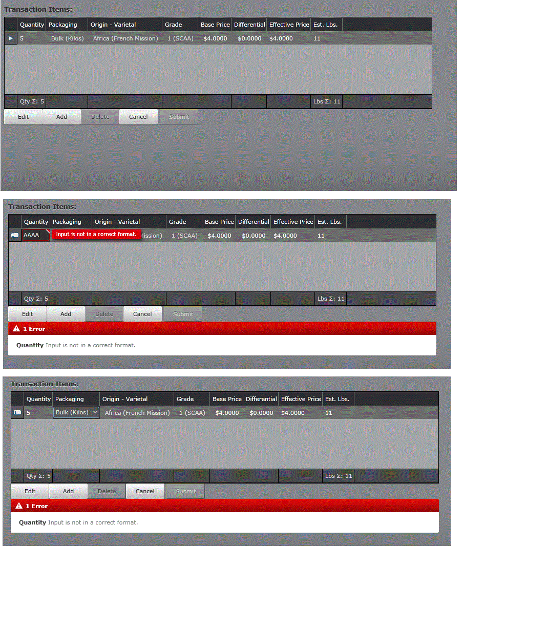 The components involved are the RadDataGrid, and a generic Silverlight ValidationSummary from the SDK. The first column in the grid is a "quantity" field with associated validation metadata on the WCF RIA side. I've attached screenshots of the conditions.