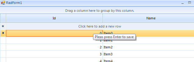 When i click to the line "Click here to add new row" on grid view. It will enter to add new mode. Can i put one more row above a new row like "Please press enter to save" and a new row will be below. Because i want to guide the customer know how to save the new row. Can i do that or some way like that ?
