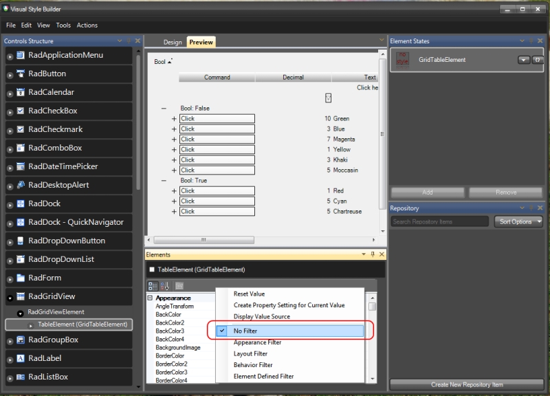 ((GridTableElement)this.radGridView1.GridElement).AlternatingRowColor = Color.Red;Let me know if you still experience any difficulties.