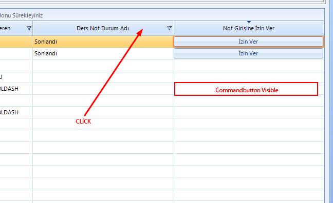 private void gvw_AcilanDersler_CellFormatting(object sender, Telerik.WinControls.UI.CellFormattingEventArgs e) { if (e.CellElement.ColumnInfo is GridViewCommandColumn) { RadButtonElement button = (RadButtonElement)e.CellElement.Children[0]; if (e.CellElement.RowInfo.Cells["AcilanDersNotDurumKod"].Value != null) { string title = e.CellElement.RowInfo.Cells["AcilanDersNotDurumKod"].Value.ToString(); if (title == "SON") { button.Visibility = ElementVisibility.Visible; ((GridCommandCellElement)e.CellElement).CommandButton.Text = Strings.NotGirisineIzinVer; } else if (title == "IZI") { button.Visibility = ElementVisibility.Visible; ((GridCommandCellElement)e.CellElement).CommandButton.Text = Strings.NotGirisiIzniniGeriAl; } else { button.Visibility = ElementVisibility.Hidden; } } else { button.ResetValue(RadElement.VisibilityProperty, ValueResetFlags.Local); } } }More information and examples are available here: Formatting Cells | UI for WinForms Documentation.