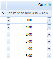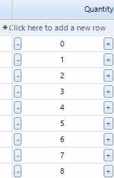 public class CustomCellElement : GridDataCellElement{ private RadButtonElement radButtonElement; private RadButtonElement radButtonElement1; private RadTextBoxElement radTextBoxElement; public CustomCellElement(GridViewColumn column, GridRowElement row) : base(column, row) { } protected override void CreateChildElements() { base.CreateChildElements(); radButtonElement = new RadButtonElement { Text = "-", Margin = new Padding(1, 1, 2, 1) }; radButtonElement.Click += new EventHandler(radButtonElement_Click); this.Children.Add(radButtonElement); this.radTextBoxElement = new RadTextBoxElement { Margin = new Padding(1, 1, 1, 1), TextAlign = HorizontalAlignment.Right }; this.Children.Add(radTextBoxElement); radButtonElement1 = new RadButtonElement { Text = "+", Margin = new Padding(2, 1, 1, 1) }; radButtonElement1.Click += new EventHandler(radButtonElement1_Click); this.Children.Add(radButtonElement1); } private void radButtonElement_Click(object sender, EventArgs e) { int value = Convert.ToInt32(radTextBoxElement.Text) - 1; if (value > 0) radTextBoxElement.Text = Convert.ToString(value); } private void radButtonElement1_Click(object sender, EventArgs e) { int value = Convert.ToInt32(radTextBoxElement.Text) + 1; if (value > 0) radTextBoxElement.Text = Convert.ToString(value); } protected override void DisposeManagedResources() { radButtonElement.Click -= new EventHandler(radButtonElement_Click); radButtonElement1.Click -= new EventHandler(radButtonElement1_Click); base.DisposeManagedResources(); } protected override Type ThemeEffectiveType { get { return typeof(GridDataCellElement); } } protected override SizeF ArrangeOverride(SizeF finalSize) { if (this.Children.Count == 3) { float textBoxWidth = finalSize.Width - radButtonElement.DesiredSize.Width - radButtonElement1.DesiredSize.Width; RectangleF buttonRect = new RectangleF(0, 0, radButtonElement.DesiredSize.Width, finalSize.Height); RectangleF textBoxRect = new RectangleF(radButtonElement.DesiredSize.Width - 1, 0, textBoxWidth - 1, finalSize.Height); RectangleF button1Rect = new RectangleF(textBoxWidth + radButtonElement.DesiredSize.Width - 1, 0, radButtonElement1.DesiredSize.Width, finalSize.Height); this.Children[0].Arrange(buttonRect); this.Children[1].Arrange(textBoxRect); this.Children[2].Arrange(button1Rect); } return finalSize; }}public class CustomColumn : GridViewDataColumn{ public CustomColumn() : base() { } public CustomColumn(string fieldName) : base(fieldName) { } public CustomColumn(string uniqueName, string fieldName) : base(uniqueName, fieldName) { } public override Type GetCellType(GridViewRowInfo row) { if (row is GridViewDataRowInfo) { return typeof(CustomCellElement); } return base.GetCellType(row); }}