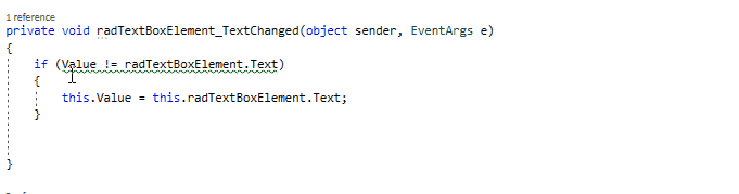 private void radTextBoxElement_TextChanged(object sender, EventArgs e){ if ((string)Value != radTextBoxElement.Text) { this.Value = this.radTextBoxElement.Text; }}