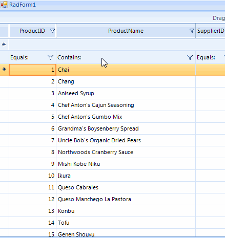 GridViewTextBoxColumn col = new GridViewTextBoxColumn();radGridView1.Columns.Add(col);col.Width = 200;radGridView1.Rows.Add("Jim");radGridView1.Rows.Add("jim");radGridView1.EnableFiltering = true;radGridView1.MasterTemplate.CaseSensitive = true;I hope that you find this information helpful. Should you have any other questions, do not hesitate to contact us.