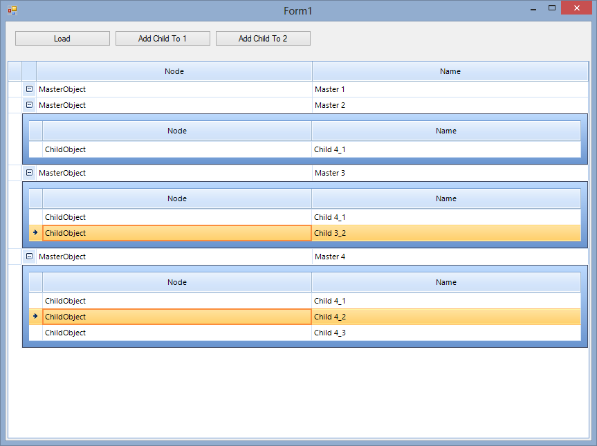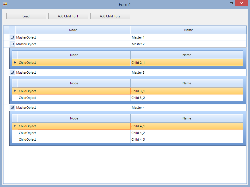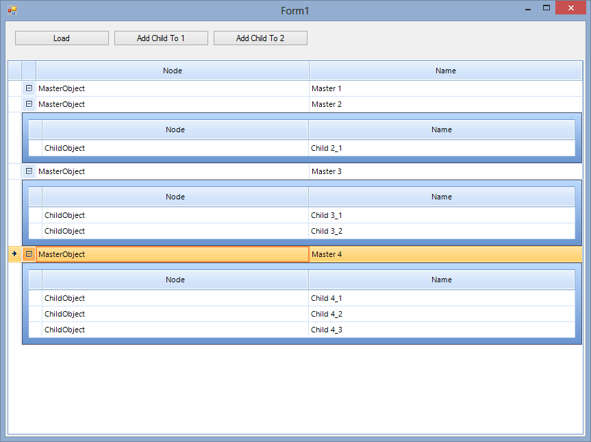 namespace TestGrid{ public partial class Form1 : Form { private BindingList<MasterObject> data; public Form1() { InitializeComponent(); SetupGrid(); } private void SetupGrid() { LoadMasterTemplate(grid.MasterTemplate); GridViewTemplate childTemplate = new GridViewTemplate(); LoadChildTemplate(childTemplate); grid.MasterTemplate.Templates.Add(childTemplate); GridViewRelation relation = new GridViewRelation(grid.MasterTemplate, childTemplate); relation.RelationName = "Children"; relation.ChildColumnNames.Add("Children"); grid.Relations.Add(relation); } private void LoadMasterTemplate(GridViewTemplate template) { template.Columns.Clear(); template.EnableFiltering = false; template.AllowAddNewRow = false; template.ShowChildViewCaptions = false; template.AutoGenerateColumns = false; template.EnableGrouping = false; GridViewTextBoxColumn colNode = new GridViewTextBoxColumn("NodeDesc"); colNode.HeaderText = "Node"; colNode.Name = "Node"; colNode.ReadOnly = true; template.Columns.Add(colNode); GridViewTextBoxColumn colName = new GridViewTextBoxColumn("Name"); colName.HeaderText = "Name"; colName.Name = "Name"; template.Columns.Add(colName); template.AutoSizeColumnsMode = GridViewAutoSizeColumnsMode.Fill; } private void LoadChildTemplate(GridViewTemplate template) { template.Columns.Clear(); template.EnableFiltering = false; template.EnableGrouping = false; template.AllowAddNewRow = false; template.AutoGenerateColumns = false; GridViewTextBoxColumn colNode = new GridViewTextBoxColumn("NodeDesc"); colNode.HeaderText = "Node"; colNode.Name = "Node"; colNode.ReadOnly = true; template.Columns.Add(colNode); GridViewTextBoxColumn colIP = new GridViewTextBoxColumn("Name"); colIP.Name = "Name"; colIP.HeaderText = "Name"; template.Columns.Add(colIP); template.AutoSizeColumnsMode = GridViewAutoSizeColumnsMode.Fill; } private void LoadData() { data = new BindingList<MasterObject>(); for (int i = 1; i < 5; i++) { MasterObject m = new MasterObject(); m.Name = "Master " + i; for (int x = 1; x < i; x++) { ChildObject c = new ChildObject(); c.Name = "Child " + i + "_" + x; m.Children.Add(c); } data.Add(m); } grid.DataSource = data; } private void button1_Click(object sender, EventArgs e) { // Load Data In Grid LoadData(); } private void button2_Click(object sender, EventArgs e) { // Add Child to 1 MasterObject m = data[0]; ChildObject c = new ChildObject(); c.Name = "Child " + "1_" + (m.Children.Count + 1); m.Children.Add(c); } private void button3_Click(object sender, EventArgs e) { // Add Child to 2 MasterObject m = data[1]; ChildObject c = new ChildObject(); c.Name = "Child " + "2_" + (m.Children.Count + 1); m.Children.Add(c); } } public class MasterObject { private string name; public string Name { get { return name; } set { if (name != value) { name = value; } } } public string NodeDesc { get { return "MasterObject"; } } private BindingList<ChildObject> children; public BindingList<ChildObject> Children { get { return children; } set { children = value; } } public MasterObject() { children = new BindingList<ChildObject>(); } } public class ChildObject { private string name; public string Name { get { return name; } set { if (name != value) { name = value; } } } public string NodeDesc { get { return "ChildObject"; } } public ChildObject() { } }}