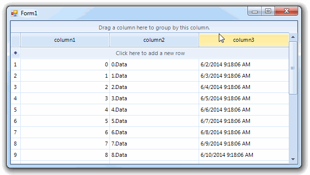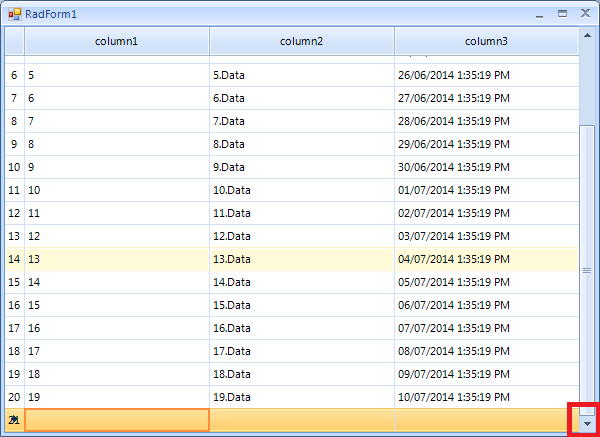 public Form1(){ InitializeComponent(); this.radGridView1.ViewCellFormatting += radGridView1_ViewCellFormatting; this.radGridView1.MouseWheel += radGridView1_MouseWheel; this.radGridView1.PreviewKeyDown += radGridView1_PreviewKeyDown; for (int i = 0; i < 20; i++) { this.radGridView1.Rows.Add(i, i + ".Data", DateTime.Now.AddDays(i)); }}private void radGridView1_PreviewKeyDown(object sender, PreviewKeyDownEventArgs e){ if (e.KeyCode == Keys.Down && radGridView1.TableElement.VScrollBar.Value >= radGridView1.TableElement.VScrollBar.Maximum - radGridView1.TableElement.VScrollBar.LargeChange && radGridView1.CurrentRow != null && radGridView1.GridNavigator.IsLastRow(radGridView1.CurrentRow)) { this.radGridView1.Rows.AddNew(); }}private void radGridView1_MouseWheel(object sender, MouseEventArgs e){ if (radGridView1.TableElement.VScrollBar.Value >= radGridView1.TableElement.VScrollBar.Maximum - radGridView1.TableElement.VScrollBar.LargeChange) { this.radGridView1.Rows.AddNew(); }}//this is used only to display a row number in the row headerprivate void radGridView1_ViewCellFormatting(object sender, Telerik.WinControls.UI.CellFormattingEventArgs e){ if (e.CellElement is GridRowHeaderCellElement) { if (e.Row is GridViewDataRowInfo) { e.CellElement.Text = (e.CellElement.RowIndex + 1).ToString(); } }}I hope this information helps. Should you have further questions, I would be glad to help.