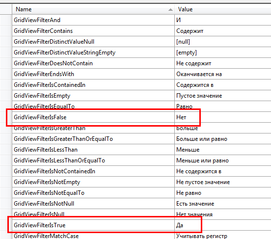 Hi! I have .resx file with localization strings for GridView filter. When I set FilteringMode in "FilterRow" mode, I see right values for True/False (column binded to boolean property), but when I use "Popup" mode - localization don't work. Is there another resourses I must localize? Example pictures attached.