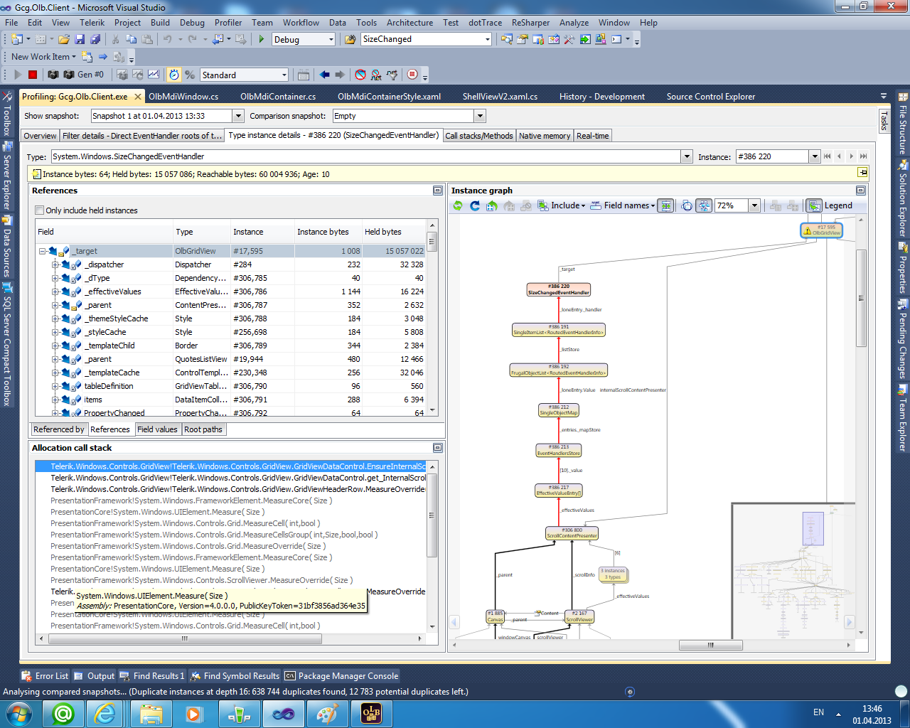 internal void EnsureInternalScrollControls(){ if (_internalScrollContentPresenter == null) { if (this.ItemsHost != null) { _internalScrollContentPresenter = this.ItemsHost.ParentOfType<ScrollContentPresenter>(); } else if (_rowTrackingRoot != null) { if (_rowTrackingRoot.First != null && _rowTrackingRoot.First.Value != null) { GridViewRowItem row = _rowTrackingRoot.First.Value; _internalScrollContentPresenter = row.ParentOfType<ScrollContentPresenter>(); } } if (_internalScrollContentPresenter != null) { _internalScrollContentPresenter.SizeChanged += new SizeChangedEventHandler(OnInternalScrollContentPresenterSizeChanged); } }...}As you can see this class subscribe on SizeChanged event. It happened when one one of parents is ScrollContentPresenter. But when we need to delete RadGridView from memory we can't do it, because we have reference (as event handler).