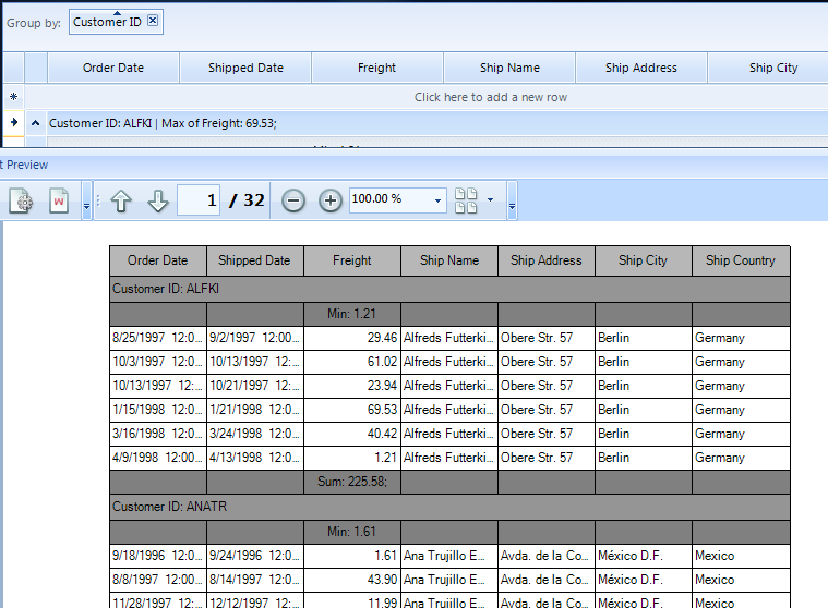 and i add a function to header row " Customer ID : ALFKI | Max of Freight: 63.53;"