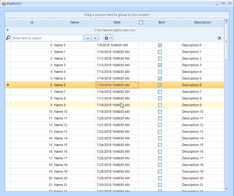 public partial class RadForm1 : Telerik.WinControls.UI.RadForm{ public RadForm1() { InitializeComponent(); this.radGridView1.CreateCell += RadGridView1_CreateCell; this.radGridView1.DataSource = this.GetData(); this.radGridView1.AutoSizeColumnsMode = Telerik.WinControls.UI.GridViewAutoSizeColumnsMode.Fill; this.radGridView1.AllowSearchRow = true; ((GridViewCheckBoxColumn)this.radGridView1.Columns["Bool"]).EnableHeaderCheckBox = true; } private void RadGridView1_CreateCell(object sender, Telerik.WinControls.UI.GridViewCreateCellEventArgs e) { if (e.CellType == typeof(GridSearchCellElement)) { e.CellType = typeof(MyGridSearchCellElement); } } private DataTable GetData() { DataTable dt = new DataTable(); dt.Columns.Add("Id", typeof(int)); dt.Columns.Add("Name", typeof(string)); dt.Columns.Add("Date", typeof(DateTime)); dt.Columns.Add("Bool", typeof(bool)); dt.Columns.Add("Description", typeof(string)); for (int i = 0; i < 100; i++) { dt.Rows.Add(i, "Name " + i, DateTime.Now.AddDays(i), i % 2 == 0, "Description " + i); } return dt; }}class MyGridSearchCellElement : GridSearchCellElement{ public MyGridSearchCellElement(GridViewColumn column, GridRowElement row) : base(column, row) { } protected override RadMenuItem CreateMatchCaseMenuItem() { RadMenuItem result = base.CreateMatchCaseMenuItem(); result.Visibility = ElementVisibility.Collapsed; return result; }}I am also attaching a short video showing the result on my end.
