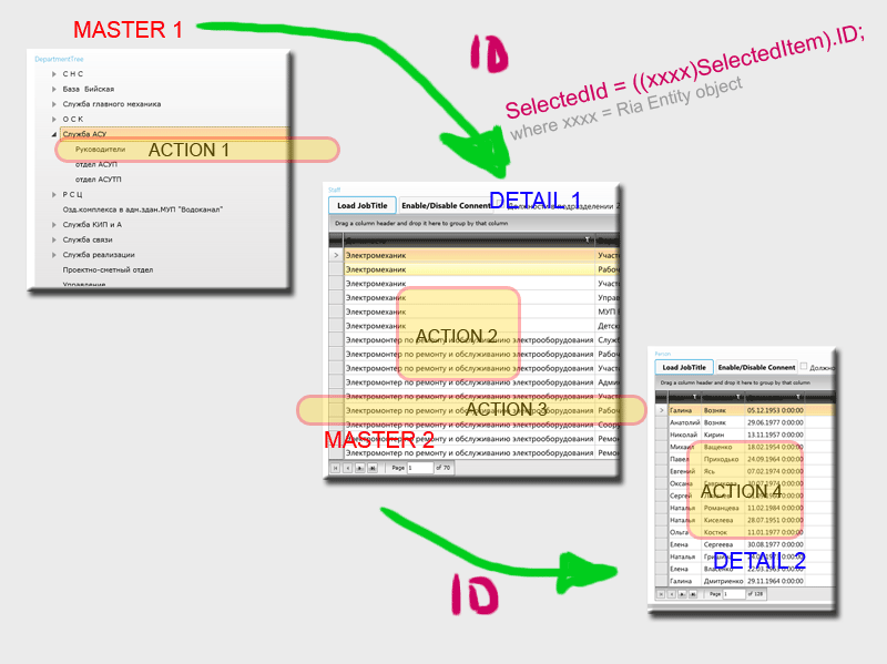 2.ACTION 3: When I click on Master2 gridview (StaffViewModel) the Detail2 (GridView) is reloaded details records for master2 (at map see ACTION 4).