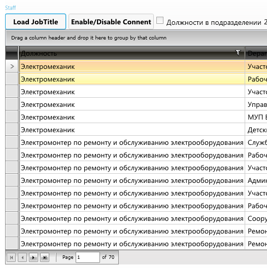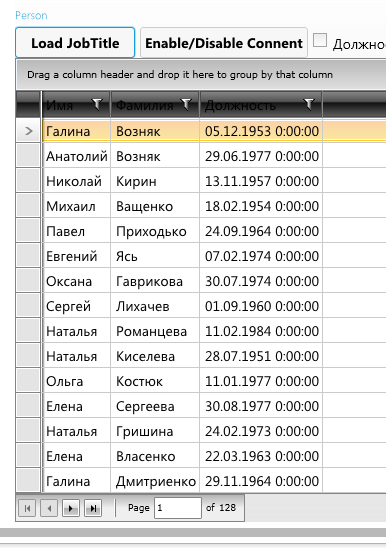 <sdk:RadGridView HorizontalAlignment="Stretch" Width="auto" x:Name="grid" PropertyChanged="grid_PropertyChanged" SelectionMode="Single" IsSynchronizedWithCurrentItem="True" ItemsSource="{Binding ElementName=DataSource, Path=Data}" AutoGenerateColumns="False"> <i:Interaction.Triggers> <i:EventTrigger EventName="SelectionChanged"> <clb:EventToCommand Command="{Binding Path=SelectionChangedCommand}" CommandParameter="{Binding ElementName=grid}" /> </i:EventTrigger> </i:Interaction.Triggers> <sdk:RadGridView.Columns> <sdk:GridViewDataColumn Header="Должность" DataMemberBinding="{Binding Path=JobTitle.Name}" /> <sdk:GridViewDataColumn Header="DepartmentTree" DataMemberBinding="{Binding Path=DepartmentTree.Name}" /> <sdk:GridViewDataColumn Header="Salary" DataMemberBinding="{Binding Path=Salary}" /> </sdk:RadGridView.Columns> </sdk:RadGridView> <riaControls:DomainDataSource AutoLoad="True" Height="0" LoadSize="60" LoadDelay="00:00:01" Name="DataSource" QueryName="{Binding Path=DetailInfo.CurrentQueryName}" DomainContext="{Binding Path=Data.BridgeContext}" Width="0" qph:QueryParametersHelper.DetailInfo="{Binding Path=DetailInfo}" FilterOperator="And"> </riaControls:DomainDataSource>Class QueryParametersHelper