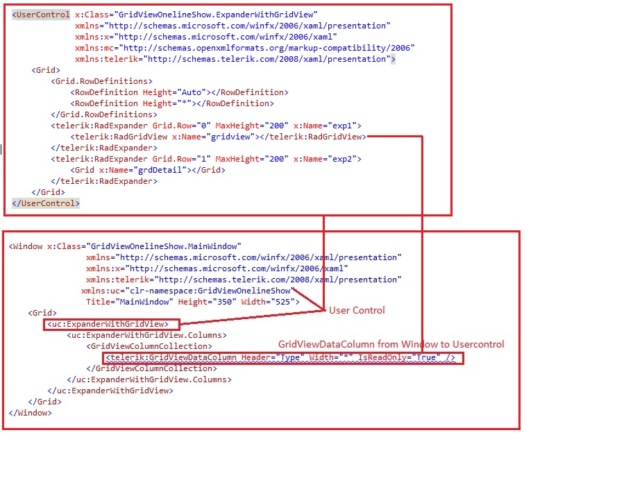 Is there a way to add the telerik GridviewColumns from the Window for Usercontrol add (like below xaml code)? If so, please share with us. And also please have a look into the attached project.