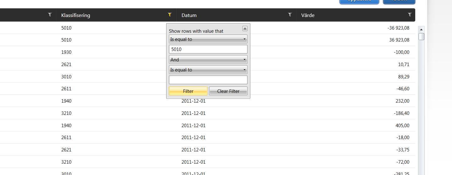 <telerik:GridViewDataColumn DataMemberBinding="{Binding Classification}" Header="Klassifisering" IsFilterable="True" IsGroupable="True" ShowDistinctFilters="False"/>