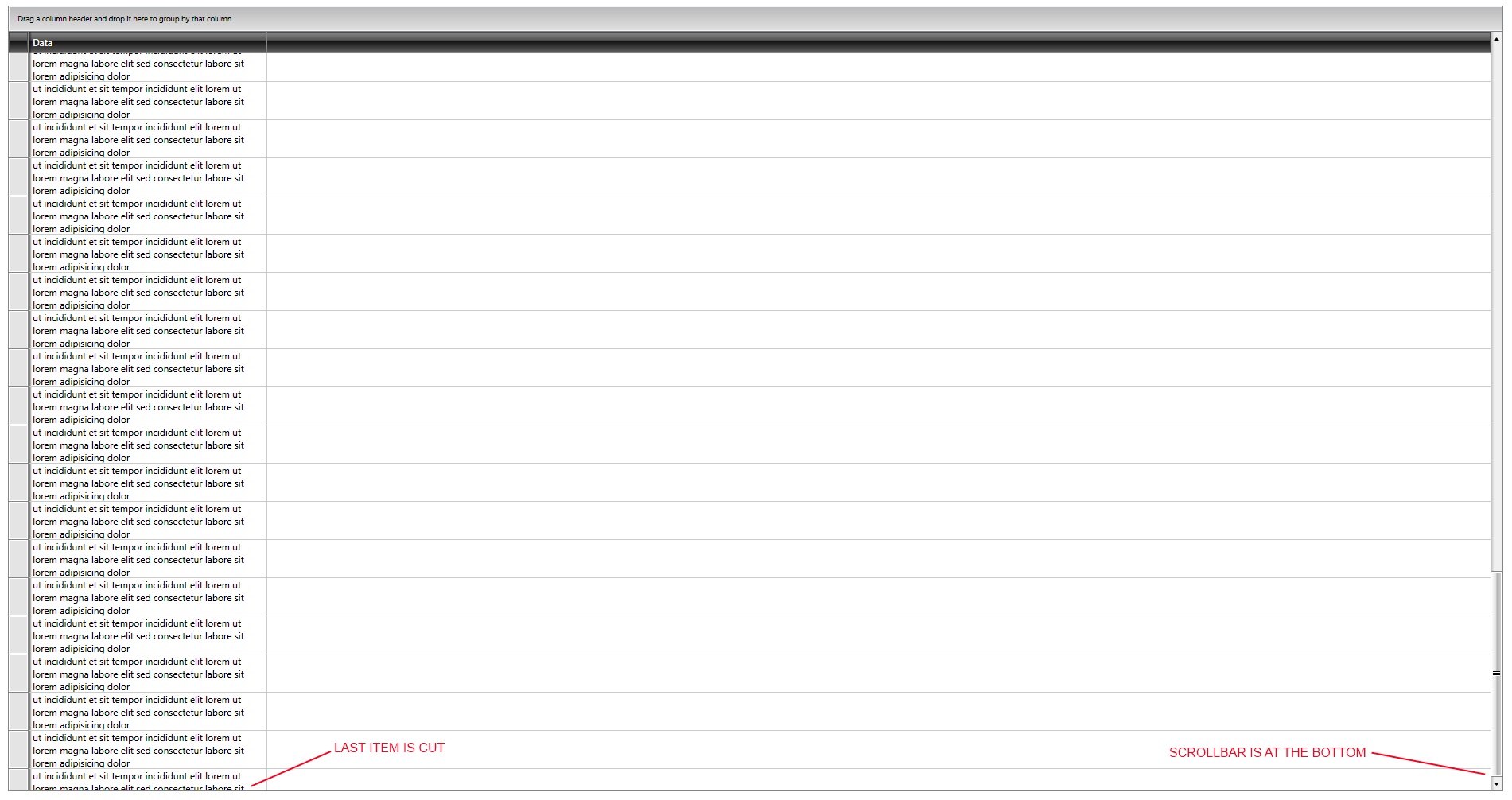 I attach the sources to reproduce the issue. I used Q3 2011. I've a grid bound to a list of items that have a property "Name". This name can be wrapped inside the datatemplate of the gridview column. If you scroll down to the bottom of the grid, the last item is not fully visible (please see attached screenshot for details). In some cases the last item is not visible at all, depending on the size of the wrapped text and the width of the column. I've played with different sizes and was able to reproduce the issue.