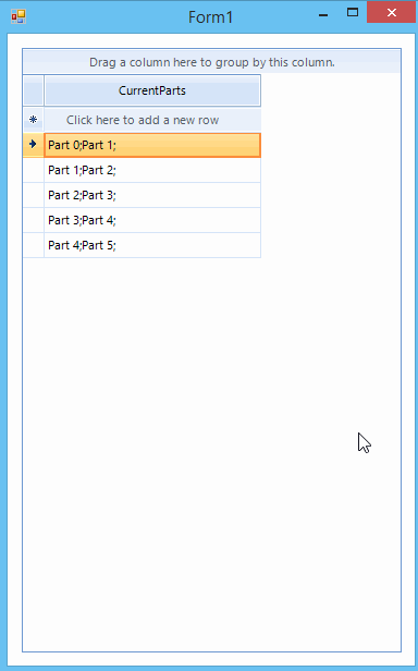 public partial class Form1 : Form{ private List<Boo> _boos; public Form1() { this.InitializeComponent(); this.InitializeList(); this.InitializeColumns(); this.radGridView.DataSource = this._boos; } private void InitializeList() { this._boos = new List<Boo>(); for (int i = 0; i < 10; i++) { Boo b = new Boo { Id = i, Value = $"Boo-{i}" }; for (int j = 0; j < 10; j++) { Foo f = new Foo { Id = j, Value = $"Foo-{i}.{j}" }; b.Foos.Add(f); } this._boos.Add(b); } } private void InitializeColumns() { var c1 = new GridViewTextBoxColumn(nameof(Boo.Id)); var c2 = new GridViewTextBoxColumn(nameof(Boo.Value)); var c3 = new GridViewCheckedDropDownListColumn(nameof(Boo.Foos)) { ValueMember = nameof(Foo.Id), DisplayMember = nameof(Foo.Value), CheckedMember = nameof(Foo.IsSelected), Width = 500 }; this.radGridView.Columns.Add(c1); this.radGridView.Columns.Add(c2); this.radGridView.Columns.Add(c3); this.radGridView.EditorRequired += c3.RadGridView_EditorRequired; }}