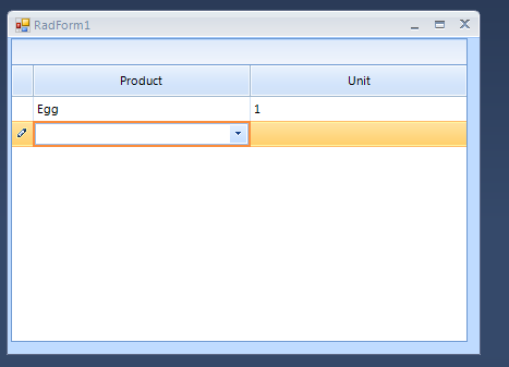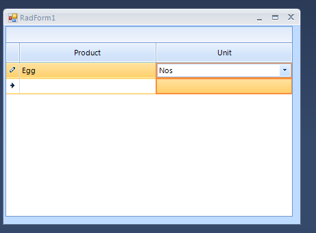 namespace TelerikWinFormsApp1{ public partial class RadForm1 : Telerik.WinControls.UI.RadForm { public RadForm1() { InitializeComponent(); } DbTask mydbtas = new DbTask(); private void RadForm1_Load(object sender, EventArgs e) { radGridView1.Rows.AddNew(); BindProductDetails(); } #region BindProductDetails private void BindProductDetails() { string Query = "SELECT ProductID,ProductName FROM tblProduct"; object[,] obj = new object[1, 2] { { "@quary_varc",Query}, }; DataSet ds = mydbtas.ExecuteQuery_SP("execute_simple_queries", obj); BindingSource productBS = new BindingSource(); productBS.DataSource = ds.Tables[0]; ((GridViewComboBoxColumn)radGridView1.Columns["clmProduct"]).DataSource = ds.Tables[0]; ((GridViewComboBoxColumn)radGridView1.Columns["clmProduct"]).ValueMember = "ProductID"; ((GridViewComboBoxColumn)radGridView1.Columns["clmProduct"]).DisplayMember = "ProductName"; } #endregion BindProductDetails public DataSet SelectUnitsByProduct(int ProductID) { object[,] obj = new object[1, 2] { { "@product_Id",ProductID}, }; DataSet Units = mydbtas.ExecuteQuery_SP("select_units_by_product", obj); return Units; } private void radGridView1_CellEndEdit(object sender, GridViewCellEventArgs e) { int rowIndex = Convert.ToInt32(e.RowIndex); if (radGridView1.Rows.Count - 1 == rowIndex) { if (radGridView1.CurrentCell.Value != null) radGridView1.Rows.AddNew(); } } private void radGridView1_CellEditorInitialized(object sender, GridViewCellEventArgs e) { if (this.radGridView1.CurrentColumn.Name == "clmUnit") { RadDropDownListEditor editor = (RadDropDownListEditor)this.radGridView1.ActiveEditor; RadDropDownListEditorElement editorElement = (RadDropDownListEditorElement)editor.EditorElement; DataSet ds = SelectUnitsByProduct(Convert.ToInt32(this.radGridView1.CurrentRow.Cells["clmProduct"].Value)); BindingSource productBS = new BindingSource(); productBS.DataSource = ds.Tables[0]; editorElement.DataSource = productBS; editorElement.ValueMember = "UnitID"; editorElement.DisplayMember = "UnitName"; editorElement.SelectedValue = null; //editorElement.SelectedValue = this.radGridView1.CurrentCell.Value; } } }}Thank you for writing back.