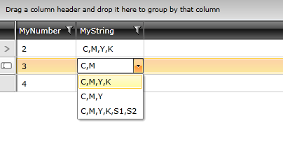<UserControl.Resources> <local:MyConverter x:Key="MyConverter" /> <Style x:Name="myStyle" TargetType="telerik:RadComboBox"> <Setter Property="OpenDropDownOnFocus" Value="True"/> <Setter Property="IsFilteringEnabled" Value="True" /> <Setter Property="CanAutocompleteSelectItems" Value="False" /> </Style> </UserControl.Resources> <Grid x:Name="LayoutRoot" Background="White"> <telerik:RadGridView x:Name="RadGridView1" AutoGenerateColumns="False"> <telerik:RadGridView.Columns> <telerik:GridViewComboBoxColumn UniqueName="MyNumber" IsComboBoxEditable="True" DataMemberBinding="{Binding MyNumber, Converter={StaticResource MyConverter}}" /> <telerik:GridViewComboBoxColumn UniqueName="MyString" IsComboBoxEditable="True" EditorStyle="{StaticResource myStyle}" DataMemberBinding="{Binding MyString}" /> </telerik:RadGridView.Columns> </telerik:RadGridView>