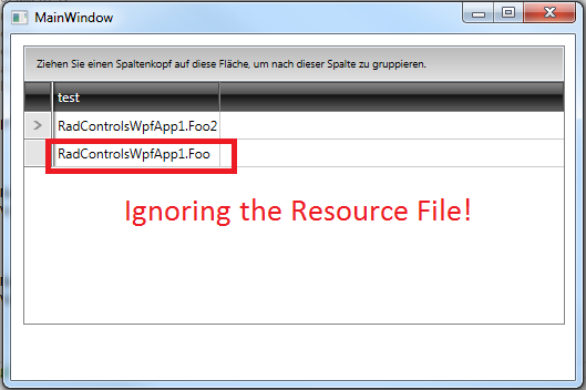 <Window x:Class="RadControlsWpfApp1.MainWindow" xmlns:telerik="http://schemas.telerik.com/2008/xaml/presentation" xmlns:local="clr-namespace:RadControlsWpfApp1" xmlns:System="clr-namespace:System;assembly=mscorlib" Title="MainWindow" Height="350" Width="525"> <Grid> <telerik:RadGridView x:Name="Grid" Grid.Column="1" Margin="11,10,9,50" Grid.Row="1" ItemsSource="{Binding}" > <telerik:RadGridView.Columns> <telerik:GridViewDataColumn IsReadOnly="True" Header="test" DataMemberBinding="{Binding}" > <telerik:GridViewDataColumn.Resources> <DataTemplate DataType="{x:Type local:Foo}"> <TextBlock Text="test" /> </DataTemplate> </telerik:GridViewDataColumn.Resources> </telerik:GridViewDataColumn> </telerik:RadGridView.Columns> </telerik:RadGridView> </Grid></Window>Code behind: