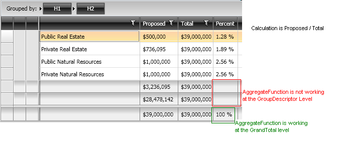 The AggregateFunction calculation works at the Grand Total level, but not at the GroupDescriptor level.