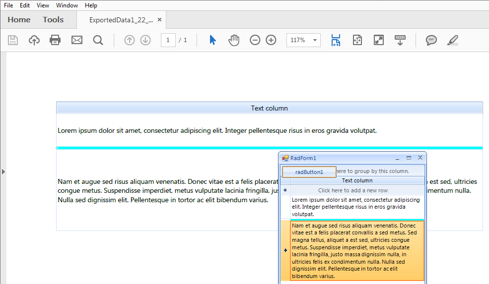 private void radButton1_Click(object sender, EventArgs e){ Telerik.WinControls.Export.GridViewPdfExport pdfExporter = new Telerik.WinControls.Export.GridViewPdfExport(this.radGridView1); string fileName = @"..\..\ExportedData" + DateTime.Now.ToLongTimeString().Replace(":", "_") ; pdfExporter.CellFormatting += pdfExporter_CellFormatting; pdfExporter.RunExport(fileName, new Telerik.WinControls.Export.PdfExportRenderer()); Process.Start(fileName + ".pdf");}private void pdfExporter_CellFormatting(object sender, Telerik.WinControls.Export.PdfExportCellFormattingEventArgs e){ e.CellElement.TextWrap = true;}2. I tried to add a row with empty cells in order to achieve the described dividers. The row's height is less than 10px because the RadGridView.AutoSizeRows property is set to true. The dividers have a similar height in the exported pdf file as it is demonstarted below. I have attached my sample project for your reference.