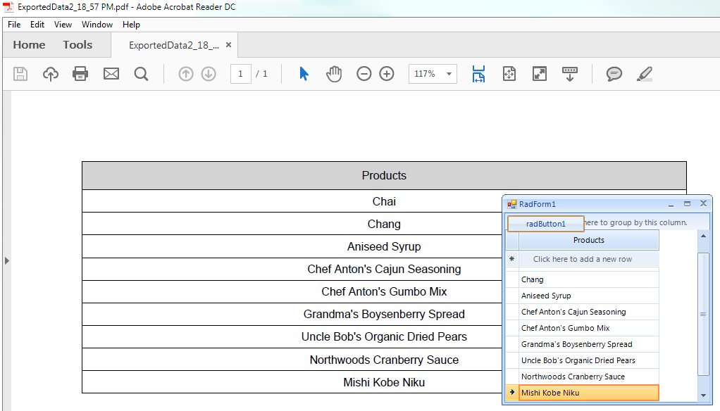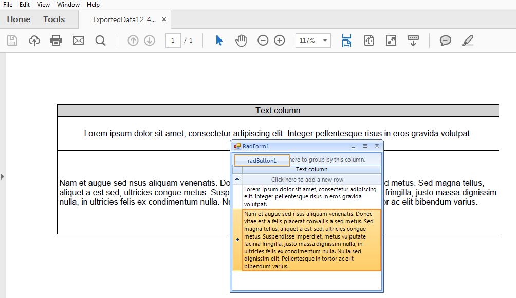 private void RadForm1_Load(object sender, EventArgs e){ this.productsTableAdapter.Fill(this.nwindDataSet.Products); GridViewComboBoxColumn comboColumn = new GridViewComboBoxColumn("Products"); comboColumn.DataSource = this.productsBindingSource; comboColumn.ValueMember = "ProductID"; comboColumn.DisplayMember = "ProductName"; comboColumn.Width = 200; this.radGridView1.Columns.Add(comboColumn); for (int i = 1; i < 10; i++) { this.radGridView1.Rows.Add(i); }}private void radButton1_Click(object sender, EventArgs e){ Telerik.WinControls.Export.GridViewPdfExport pdfExporter = new Telerik.WinControls.Export.GridViewPdfExport(this.radGridView1); string fileName = @"..\..\ExportedData" + DateTime.Now.ToLongTimeString().Replace(":", "_") ; pdfExporter.RunExport(fileName, new Telerik.WinControls.Export.PdfExportRenderer()); Process.Start(fileName + ".pdf");}However, if you use different column types to store the numeric values, note that you can add a hidden text column that holds the respective text value. Then, before exporting you can hide the numeric column and show the hidden one in order to export the desired data. Then, restore the columns visibility as before.