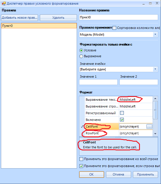 private void radGridView1_ConditionalFormattingFormShown(object sender, EventArgs e){ ConditionalFormattingForm f = sender as ConditionalFormattingForm; if (f != null) { RadPropertyGrid radPropertyGridProperties = f.Controls["radPropertyGridProperties"] as RadPropertyGrid; radPropertyGridProperties.ItemFormatting -= radPropertyGridProperties_ItemFormatting; radPropertyGridProperties.ItemFormatting += radPropertyGridProperties_ItemFormatting; }}private void radPropertyGridProperties_ItemFormatting(object sender, PropertyGridItemFormattingEventArgs e){ PropertyGridItemElement visualItem = e.VisualElement as PropertyGridItemElement; if (visualItem != null) { if (visualItem.ValueElement.Text == "MiddleLeft") { visualItem.ValueElement.Text = "aaa"; } } if (e.Item.Label == "CellFont") { e.Item.Label = "aaa"; }}Should you have further questions please let me know.