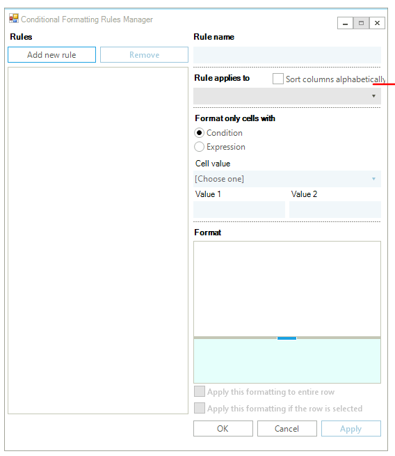 2. Conditional Formatting Rules Manager window is too narrow, that even english text doesn`t feet. User can`t change size of the window.