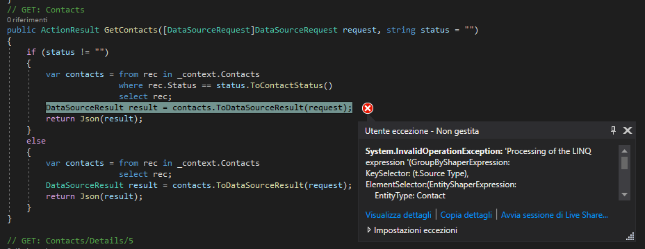 System.InvalidOperationException HResult=0x80131509 Messaggio=Processing of the LINQ expression '(GroupByShaperExpression:KeySelector: (t.Source Type), ElementSelector:(EntityShaperExpression: EntityType: Contact ValueBufferExpression: (ProjectionBindingExpression: EmptyProjectionMember) IsNullable: False))' by 'RelationalProjectionBindingExpressionVisitor' failed. This may indicate either a bug or a limitation in EF Core.