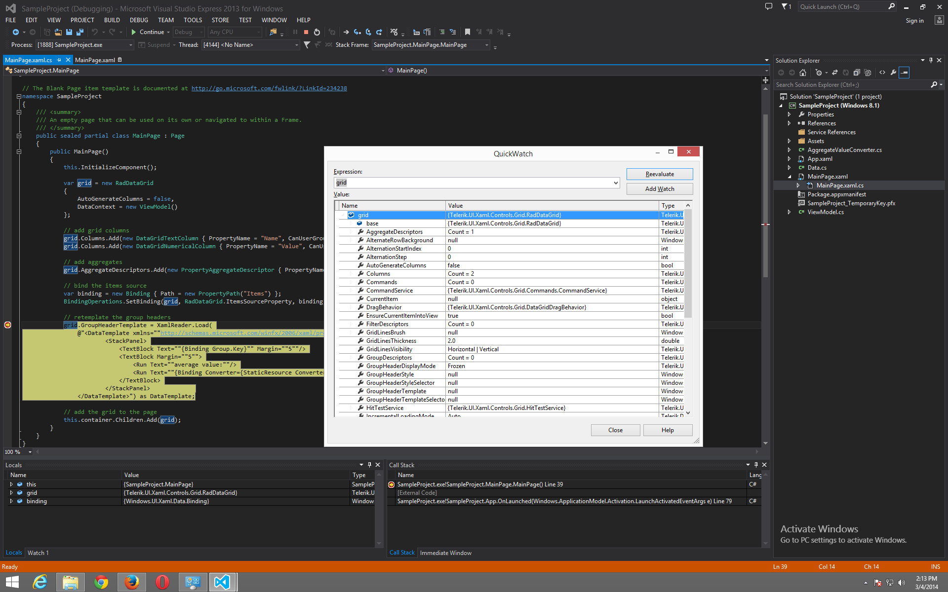 I have tested the sample project with Visual Studio Express 2013 and I was able to see the RadDataGrid properties in the quick watch (I have attached a screenshot). I found this article that describes a similar issue: