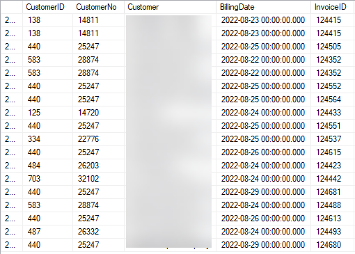 I have a table setup to group. If I group By InvoiceID, it work fine, it groups by Invoice. If I try to group by CustomerID I get either 1 or 0 groups returned. I know it's not the data because for every InvoiceID, there is a CustomerID, which you can see from my sample. What am I doing incorrectly??