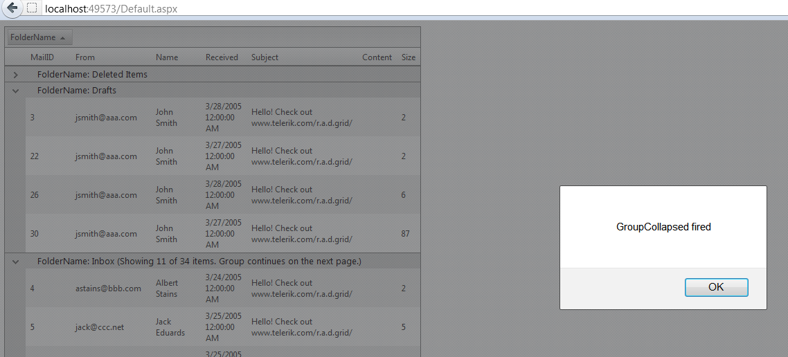 radGrid.ShowGroupPanel = true;radGrid.MasterTableView.GroupLoadMode = GridGroupLoadMode.Client;radGrid.ClientSettings.AllowDragToGroup = true;radGrid.ClientSettings.AllowExpandCollapse = true;radGrid.ClientSettings.ClientEvents.OnGroupExpanded = "GroupExpanded";radGrid.ClientSettings.ClientEvents.OnGroupCollapsed = "GroupCollapsed";radGrid.GroupingSettings.ShowUnGroupButton = true;function GroupExpanded(s, e) { alert('GroupExpanded');}Am I missing something?
