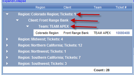 <telerik:RadGrid ID="rg2" runat="server" Skin="Web20" AllowAutomaticUpdates="false" AllowAutomaticDeletes="true" AutoGenerateColumns="false" AllowSorting="true" AllowPaging="false" ShowFooter="true" ShowGroupPanel="false" ShowGroupHeader="true" OnItemDataBound="rg1_ItemDataBound" OnPreRender="rg2_PreRender"> <MasterTableView ShowGroupFooter="false" GroupsDefaultExpanded="false" HeaderStyle-BackColor="#7FA5D7" ItemStyle-BackColor="White" AlternatingItemStyle-BackColor="#B0C4DE" FooterStyle-Font-Bold="true"> <Columns> <telerik:GridBoundColumn HeaderText="Region" DataField="Region"> </telerik:GridBoundColumn> <telerik:GridBoundColumn HeaderText="Client" DataField="ClientName"> </telerik:GridBoundColumn> <telerik:GridBoundColumn HeaderText="Team" DataField="TeamName" Aggregate="Count"> </telerik:GridBoundColumn> <telerik:GridTemplateColumn HeaderText="Ticket #" UniqueName="TicketNumber" DataField="TicketNumber"> <ItemTemplate> <asp:HyperLink ID="hlTicket" runat="server" Text='<%# Bind("TicketNumber") %>'></asp:HyperLink> </ItemTemplate> </telerik:GridTemplateColumn> <telerik:GridBoundColumn HeaderText="TicketID" DataField="TicketID" Visible="false"> </telerik:GridBoundColumn> <telerik:GridBoundColumn DataField="TotalTickets" Visible="false"> </telerik:GridBoundColumn> <telerik:GridBoundColumn DataField="GridID" Visible="false"> </telerik:GridBoundColumn> </Columns> <GroupByExpressions> <telerik:GridGroupByExpression> <GroupByFields> <telerik:GridGroupByField FieldName="Region" /> </GroupByFields> <SelectFields> <telerik:GridGroupByField FieldName="Region" HeaderText="Region" SortOrder="Ascending" /> </SelectFields> </telerik:GridGroupByExpression> </GroupByExpressions> <GroupByExpressions> <telerik:GridGroupByExpression> <GroupByFields> <telerik:GridGroupByField FieldName="ClientName" /> </GroupByFields> <SelectFields> <telerik:GridGroupByField FieldName="ClientName" HeaderText="Client" SortOrder="Ascending" /> </SelectFields> </telerik:GridGroupByExpression> </GroupByExpressions> <GroupByExpressions> <telerik:GridGroupByExpression> <GroupByFields> <telerik:GridGroupByField FieldName="TeamName" /> </GroupByFields> <SelectFields> <telerik:GridGroupByField FieldName="TeamName" HeaderText="Team" SortOrder="Ascending" /> </SelectFields> </telerik:GridGroupByExpression> </GroupByExpressions> </MasterTableView> </telerik:RadGrid>