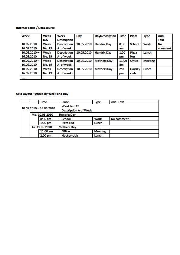 The content of the group header will not appear (visible = false) as a grid column. Only the real detail information will shown as as grid column. In the sample link you can see that the "first group criteria" is the Week and the "second group criteria" is the date.