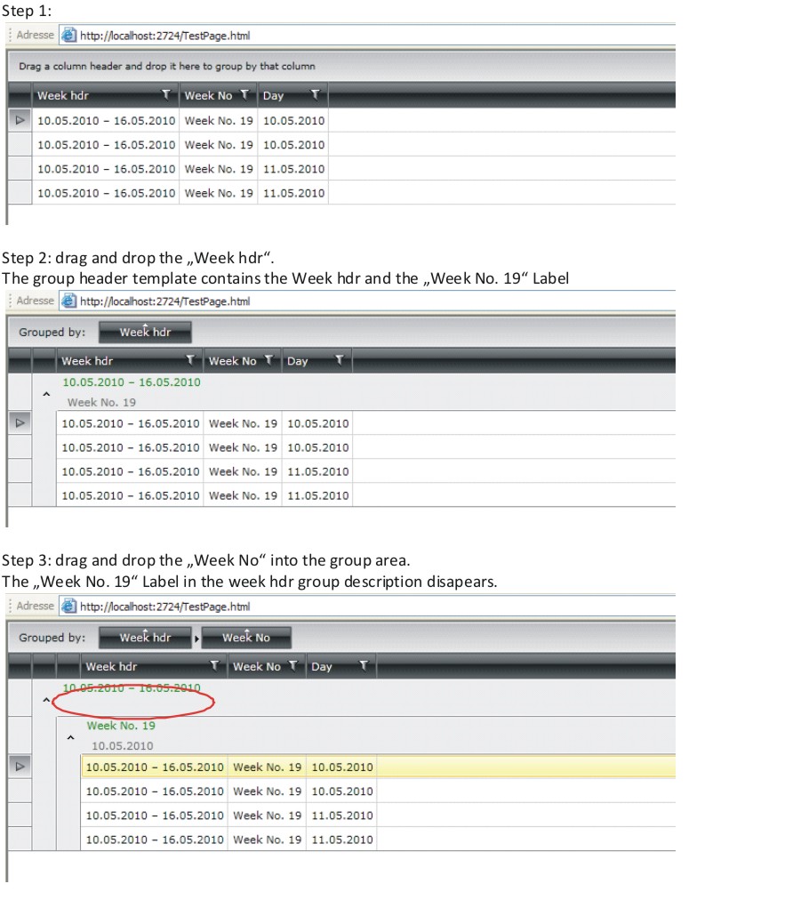 I will try to submit you an example by creating a support ticket. Just start the sample. The sample itselve groups the grid by "Week" and the group header contains different values displayed in list controls. Please take the sample and group it a second time by "Day". The sample will now show the second group header but the first group header will loose all date except the group.key.