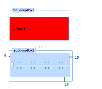 public Form1(){ InitializeComponent(); this.radGroupBox1.AutoSize = true; this.radGroupBox1.Padding = new Padding(2, 30, 5, 5); this.radPanel1.BackColor = Color.Red; this.radPanel1.Dock = DockStyle.Fill; this.radPanel1.Size = new Size(200, 80); this.radGroupBox2.AutoSize = true; this.radGroupBox2.Padding = new Padding(5, 18,10, 15); this.radTrackBar1.Dock = DockStyle.Fill; this.radTrackBar1.AutoSize = false; this.radTrackBar1.Size = new Size(200, 80);}Both of RadGroupBox controls have correct padding when the inner control fills the entire content. Please find the attached screenshot. Could you please provide your sample code replicating the undesired behavior? Thank you in advance.