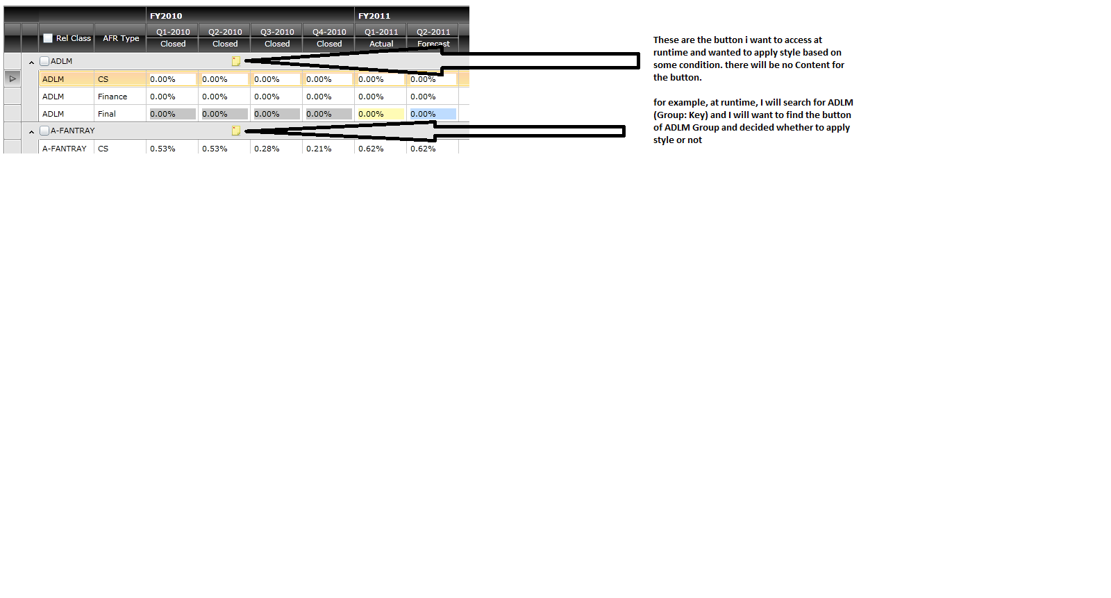 What i am trying to do is, in the GroupHeaderTemplate, I have a datatemplate which has a button. So after the grid is loaded, based on the user action in the screen, the button style need to be applied or removed based on the condition, to apply the sytle i will have to get the control button of that particular group and then apply the style using SetBinding.