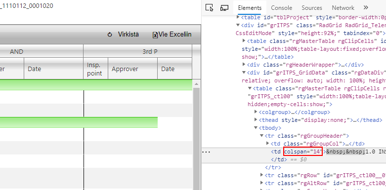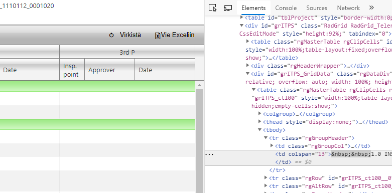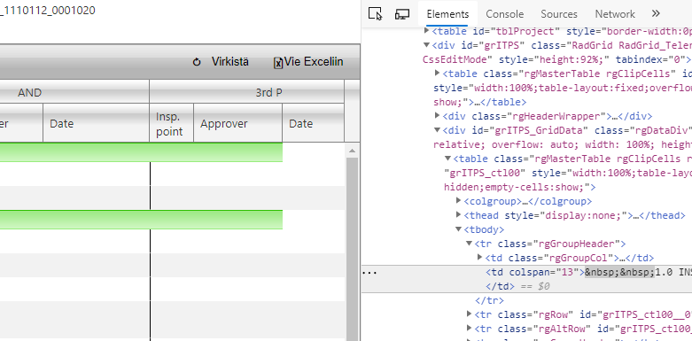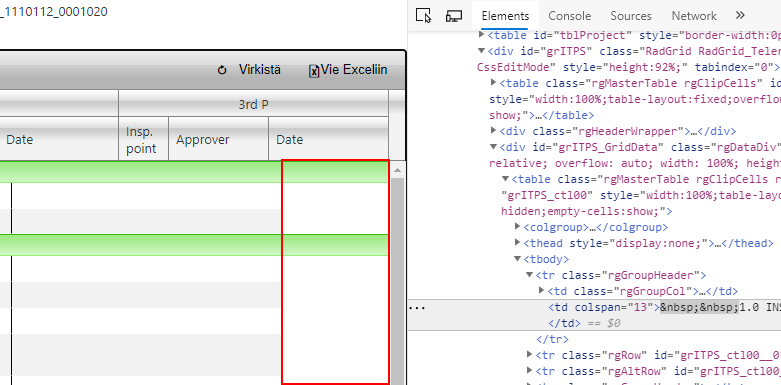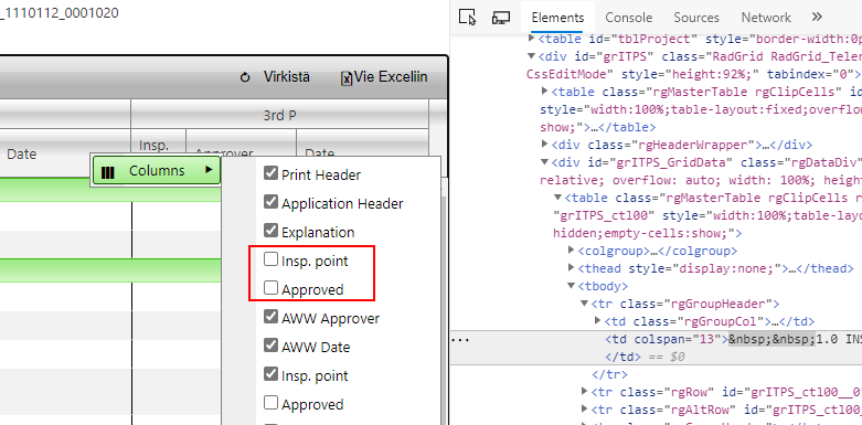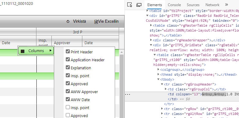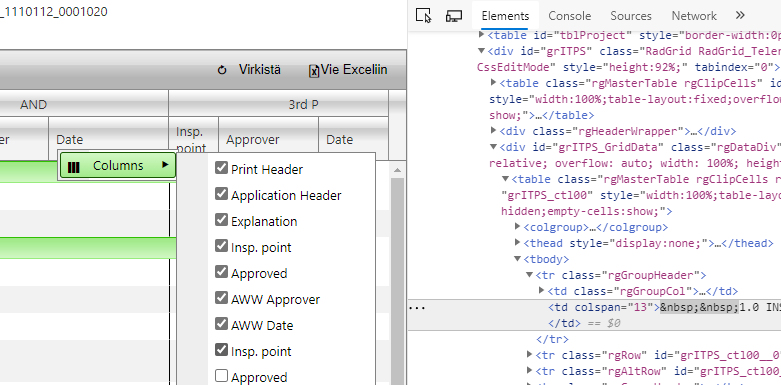 001.<telerik:RadGrid ID="grITPS" DataSourceID="odsITP" CssClass="CssEditMode" runat="server" Height="92%"002. AllowAutomaticUpdates="True" EnableHeaderContextMenu="True" AutoGenerateColumns="False" AllowMultiRowEdit="True"003. OnItemDataBound="grITPS_ItemDataBound" OnPreRender="grITPS_PreRender"004. OnExcelMLExportStylesCreated="grITPS_ExcelMLExportStylesCreated" OnExcelMLWorkBookCreated="grITPS_ExcelMLWorkBookCreated" OnExcelMLExportRowCreated="grITPS_ExcelMLExportRowCreated" >005. <GroupingSettings CollapseAllTooltip="Collapse all groups"></GroupingSettings>006. <ClientSettings AllowGroupExpandCollapse="true">007. <Selecting AllowRowSelect="True" EnableDragToSelectRows="false" />008. <Scrolling AllowScroll="True" UseStaticHeaders="True" />009. <ClientEvents OnCommand="onCommand" OnUserAction="userAction" />010. </ClientSettings>011. <ExportSettings Excel-FileExtension="xls" Excel-Format="ExcelML" ExportOnlyData="true">012. <Pdf PageWidth="">013. </Pdf>014. </ExportSettings>015. 016. <MasterTableView DataSourceID="odsITP" CommandItemDisplay="Top" EditMode="Batch" DataKeyNames="ID" TableLayout="Fixed"017. AllowFilteringByColumn="False" AllowMultiColumnSorting="False" AllowNaturalSort="False" AllowSorting="False" EnableLinqGrouping="False" GroupLoadMode="Client">018. <BatchEditingSettings EditType="Row" HighlightDeletedRows="true" />019. <CommandItemSettings ShowExportToExcelButton="True" ExportToExcelText="Vie Exceliin" ShowExportToPdfButton="False" ShowRefreshButton="True" RefreshText="Virkistä" ShowSaveChangesButton="true" SaveChangesText="Tallenna" ShowCancelChangesButton="true" CancelChangesText="Peruuta" ShowAddNewRecordButton="False" />020. <ColumnGroups>021. <telerik:GridColumnGroup HeaderText="REC" Name="Record" HeaderStyle-HorizontalAlign="Center">022. </telerik:GridColumnGroup>023. <telerik:GridColumnGroup HeaderText="S" Name="Supplier" HeaderStyle-HorizontalAlign="Center">024. </telerik:GridColumnGroup>025. <telerik:GridColumnGroup HeaderText="3rd P" Name="ThirdParty" HeaderStyle-HorizontalAlign="Center">026. </telerik:GridColumnGroup>027. <telerik:GridColumnGroup HeaderText="C" Name="Customer" HeaderStyle-HorizontalAlign="Center">028. </telerik:GridColumnGroup>029. <telerik:GridColumnGroup HeaderText="LA" Name="LocalAuthority" HeaderStyle-HorizontalAlign="Center">030. </telerik:GridColumnGroup>031. </ColumnGroups>032. <Columns>033. <telerik:GridBoundColumn DataField="ID" HeaderText="ID" SortExpression="ID" UniqueName="ID" DataType="System.Int32" FilterControlAltText="Filter ID column" HeaderStyle-Width="100px" ItemStyle-Width="100px" Visible="False" ForceExtractValue="Always"></telerik:GridBoundColumn>034. <telerik:GridBoundColumn DataField="PrintHeader" HeaderText="Print Header" SortExpression="PrintHeader" UniqueName="PrintHeader" FilterControlAltText="Filter PrintHeader column" ReadOnly="True" HeaderStyle-Width="200px" ItemStyle-Width="200px" ForceExtractValue="Always"></telerik:GridBoundColumn>035. <telerik:GridBoundColumn DataField="ApplicationHeader" HeaderText="Application Header" SortExpression="ApplicationHeader" UniqueName="ApplicationHeader" FilterControlAltText="Filter ApplicationHeader column" ReadOnly="True" HeaderStyle-Width="200px" ItemStyle-Width="200px" ForceExtractValue="Always"></telerik:GridBoundColumn>036. <telerik:GridBoundColumn DataField="Explanation" HeaderText="Explanation" SortExpression="Explanation" UniqueName="Explanation" FilterControlAltText="Filter Explanation column" ReadOnly="True" HeaderStyle-Width="200px" ItemStyle-Width="200px" ForceExtractValue="Always"></telerik:GridBoundColumn>037. 038. <telerik:GridTemplateColumn UniqueName="ApprovalInspectionPoint" DataField="ApprovalInspectionPoint" HeaderText="Insp. point" FilterControlAltText="Filter ApprovalInspectionPoint column" SortExpression="ApprovalInspectionPoint" ColumnGroupName="Record" ForceExtractValue="Always" Display="False">039. <HeaderStyle Width="50px"></HeaderStyle>040. <ItemStyle Width="40px"></ItemStyle>041. <ItemTemplate>042. <telerik:RadLabel ID="lblApprovalInspectionPoint" runat="server" Text='<%# Eval("ApprovalInspectionPoint") %>' Width="40px"></telerik:RadLabel>043. </ItemTemplate>044. <EditItemTemplate>045. <telerik:RadComboBox ID="cmbApprovalInspectionPoint" runat="server" DataSourceID="odsInspectionPoint" DataTextField="COD" DataValueField="COD" Width="40px"></telerik:RadComboBox>046. </EditItemTemplate>047. </telerik:GridTemplateColumn>048. <telerik:GridTemplateColumn DataField="ApprovalCheck" HeaderText="Approved" UniqueName="ApprovalCheck" HeaderStyle-Width="80px" ItemStyle-Width="80px" ColumnGroupName="Record" ForceExtractValue="Always" Display="False">049. <ItemTemplate>050. <asp:CheckBox runat="server" ID="chbApprovalCheck1" Enabled="true" Checked='<%# Eval("ApprovalCheck") %>' onclick="checkBoxClick(this, event);" />051. </ItemTemplate>052. <EditItemTemplate>053. <asp:CheckBox runat="server" ID="chbApprovalCheck2" />054. </EditItemTemplate>055. </telerik:GridTemplateColumn>056. <telerik:GridTemplateColumn UniqueName="ApprovalUser" DataField="ApprovalUser" HeaderText="AWW Approver" FilterControlAltText="Filter ApprovalUser column" SortExpression="ApprovalUser" ColumnGroupName="Record" ForceExtractValue="Always" Display="False">057. <HeaderStyle Width="100px"></HeaderStyle>058. <ItemTemplate>059. <telerik:RadLabel ID="lblApprovalUser" runat="server" Text='<%# Eval("ApprovalUser").ToString() %>' Width="95px"></telerik:RadLabel>060. </ItemTemplate>061. <EditItemTemplate>062. <telerik:RadComboBox ID="cmbApprovalUser" runat="server" DataSourceID="odsApprovalUser" DataTextField="Full_name" DataValueField="User_ID" AllowCustomText="True" Filter="Contains" Width="90px" />063. </EditItemTemplate>064. </telerik:GridTemplateColumn>065. <telerik:GridTemplateColumn UniqueName="ApprovalDate" DataField="ApprovalDate" HeaderText="AWW Date" FilterControlAltText="Filter ApprovalDate column" SortExpression="ApprovalDate" ColumnGroupName="Record" ForceExtractValue="Always" Display