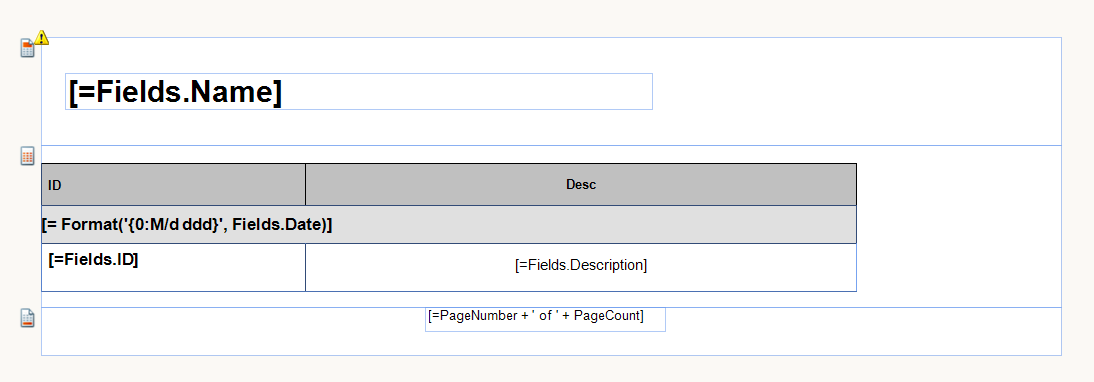 3. Add new GroupHeader Section including the TextBox with the formatted date. This group should be dynamic group with Grouping like for example: =Fields.Date