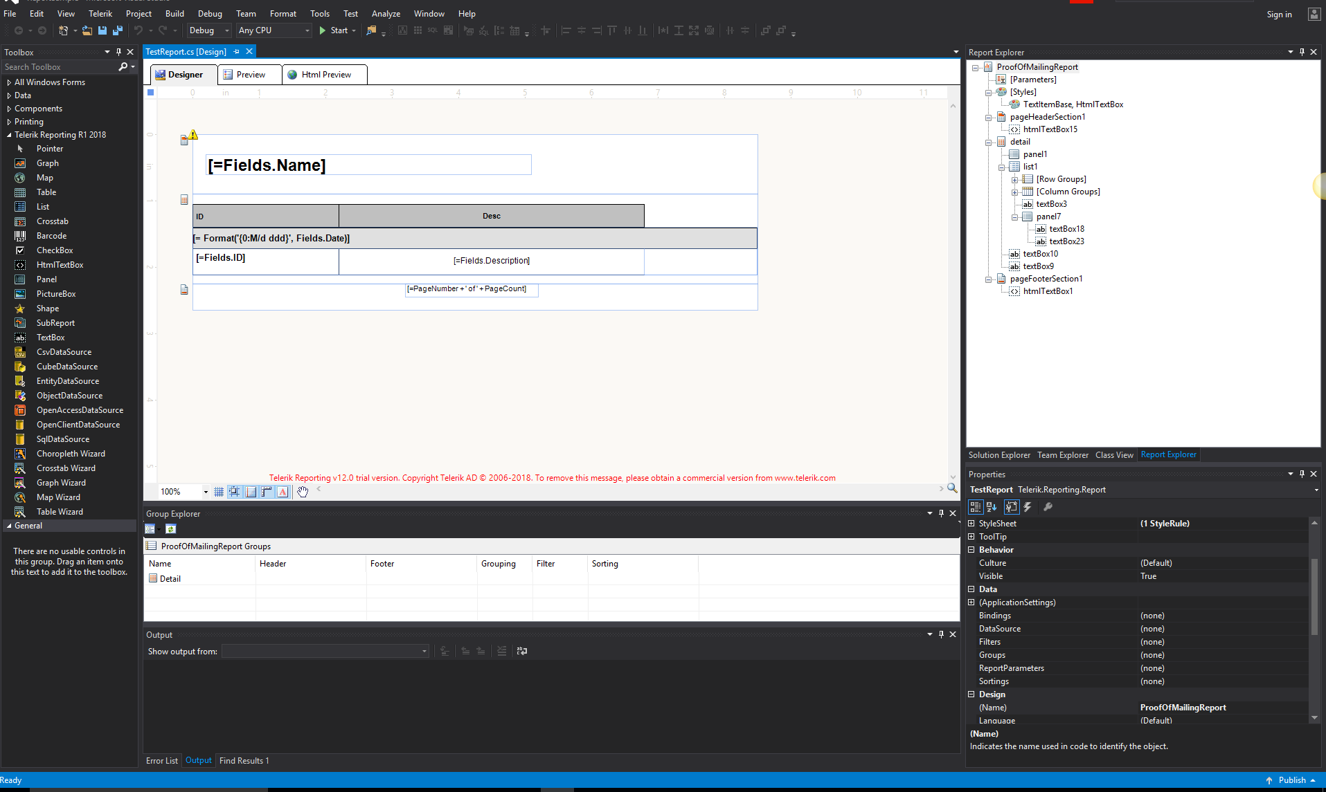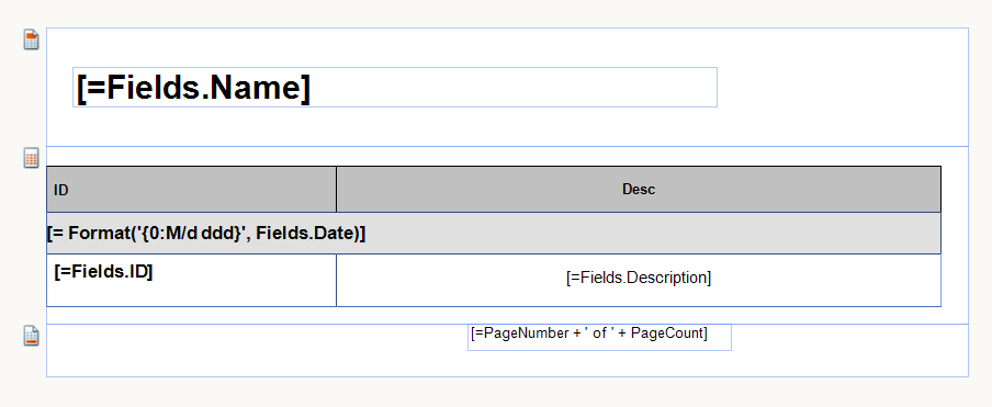 4. In the Detail Section add two TextBox items for Fields.ID and Fields.Description. They will be rendered once for every row in the data source.