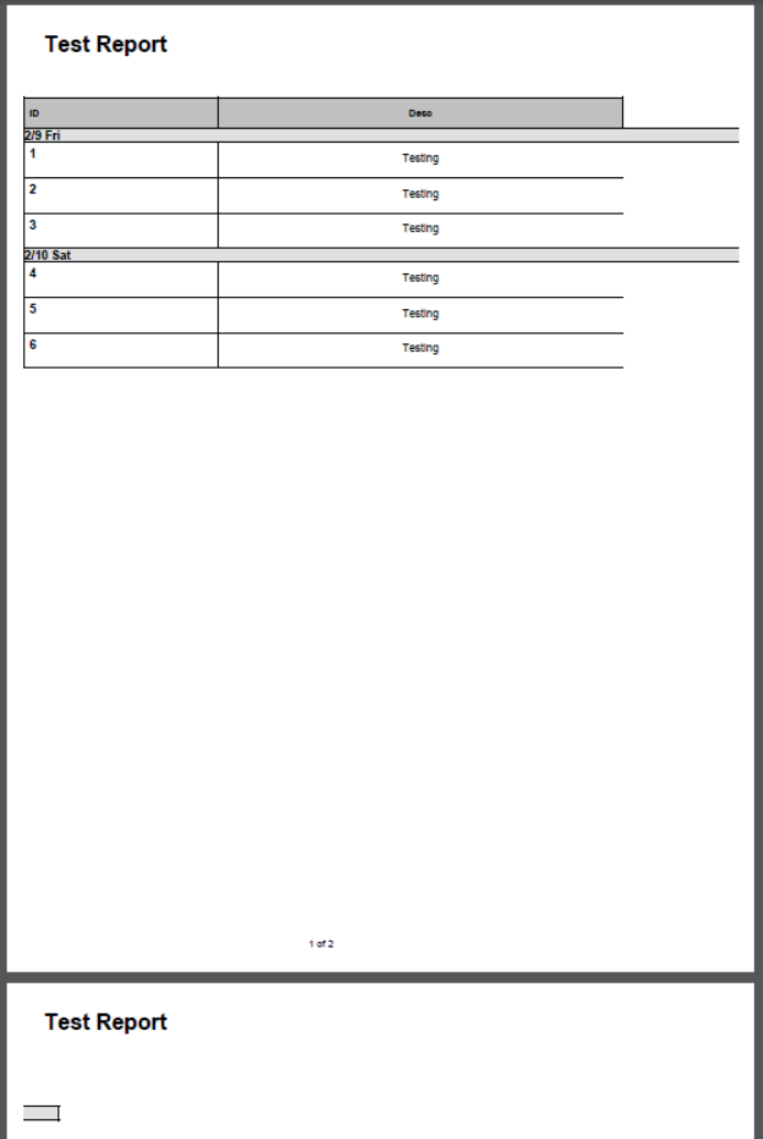 Thank you for your reply. We tried adjust margins and page size but the list's grouped header that wraps. Hopefully we're not going about it the wrong way (basically trying to group the data by date). A screenshot is attached, and here is a sample project that demonstrates the issue: