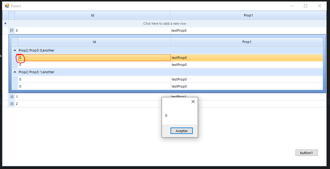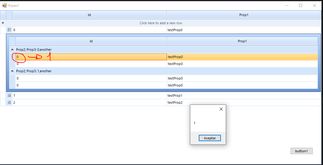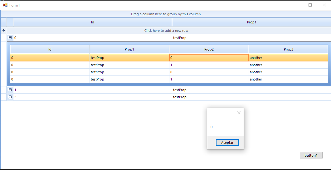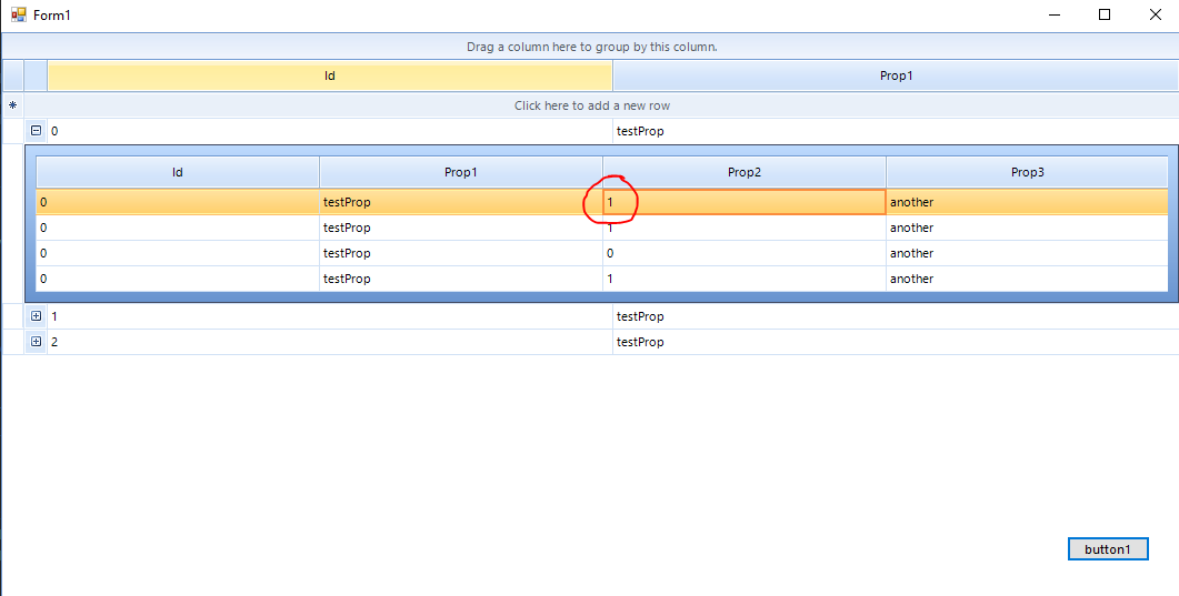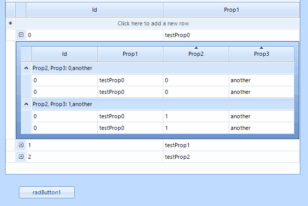 public partial class Form1 : Form { BindingList<Parent> data; public Form1() { InitializeComponent(); InitGrid(); data = new BindingList<Parent>(); for (int i = 0; i < 3; i++) { Parent parent = new Parent() { Id = i, Prop1 = "testProp" + i }; for (int j = 0; j < 4; j++) { Child2 child = new Child2() { Id = i * j, Prop1 = "testProp" + i, Prop2 = j % 2, Prop3 = "another" }; parent.children.Add(child); } data.Add(parent); } this.radGridView1.DataSource = data; this.radGridView1.CellDoubleClick += radGridView1_CellDoubleClick; } void radGridView1_CellDoubleClick(object sender, GridViewCellEventArgs e) { Child2 child = e.Row.DataBoundItem as Child2; MessageBox.Show(child.Prop2.ToString()); } private void InitGrid() { this.radGridView1.Columns.Add(CreateColumn("Id")); this.radGridView1.Columns.Add(CreateColumn("Prop1")); GridViewTemplate template = new GridViewTemplate(); template.AllowAddNewRow = false; template.AllowDeleteRow = false; template.AllowEditRow = false; template.AutoGenerateColumns = false; template.Columns.Add(CreateColumn("Id")); template.Columns.Add(CreateColumn("Prop1")); template.Columns.Add(CreateColumn("Prop2")); template.Columns.Add(CreateColumn("Prop3")); GridViewRelation r = new GridViewRelation(this.radGridView1.MasterTemplate, template); r.ChildColumnNames.Add("children"); template.AutoSizeColumnsMode = GridViewAutoSizeColumnsMode.Fill; template.EnableFiltering = false; template.EnableGrouping = true; template.ShowColumnHeaders = true; template.ShowRowHeaderColumn = false; this.radGridView1.EnableGrouping = false; this.radGridView1.EnableCustomGrouping = false; GroupDescriptor gd = new GroupDescriptor(); gd.GroupNames.Add("Prop2", ListSortDirection.Ascending); gd.GroupNames.Add("Prop3", ListSortDirection.Ascending); template.GroupDescriptors.Add(gd); this.radGridView1.Templates.Add(template); this.radGridView1.Relations.Add(r); this.radGridView1.AutoSizeColumnsMode = GridViewAutoSizeColumnsMode.Fill; } GridViewTextBoxColumn CreateColumn(string Field) { GridViewTextBoxColumn col = new GridViewTextBoxColumn(); col.Name = Field; col.FieldName = Field; col.HeaderText = Field; return col; } private void button1_Click(object sender, EventArgs e) { this.data.First().children.First().Prop2 = 1; } }When I Click Button1 nothing happens