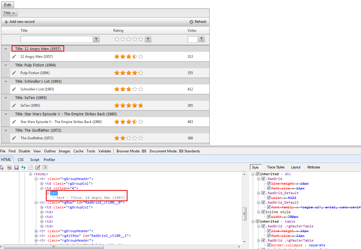 I have attached a screenshot that show the grid and the HTML markup generated below it