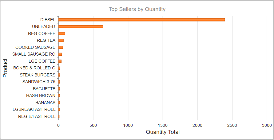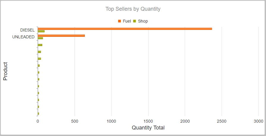 I have a list of Top Sellers for a shop. These top sellers are categorized by department types (i.e. Fuel, Shop, etc.). When displayed in a bar chart without the grouping, the Fuel group rather skews the results on the chart as seen in the screenshot (topsellers.png). All bars are the same color and there is no legend.