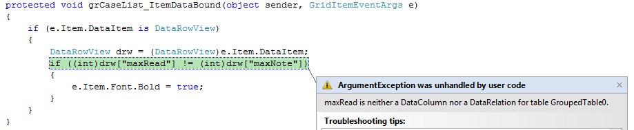 protected void grCaseList_ItemDataBound(object sender, GridItemEventArgs e) { if (e.Item.DataItem is DataRowView) { DataRowView drw = (DataRowView)e.Item.DataItem; if ((int)drw["maxRead"] != (int)drw["maxNote"]) { e.Item.Font.Bold = true; } } }<telerik:RadGrid ID="grCaseList" runat="server" Skin="Windows7" AllowPaging="True" AllowSorting="True" GridLines="None" ShowGroupPanel="True" Width="100%" AutoGenerateColumns="False" onitemdatabound="grCaseList_ItemDataBound"> <HeaderContextMenu CssClass="GridContextMenu GridContextMenu_Windows7"></HeaderContextMenu> <MasterTableView EnableColumnsViewState="false"> <CommandItemSettings ExportToPdfText="Export to Pdf"> </CommandItemSettings> <RowIndicatorColumn> <HeaderStyle Width="20px"></HeaderStyle> </RowIndicatorColumn> <ExpandCollapseColumn> <HeaderStyle Width="20px"></HeaderStyle> </ExpandCollapseColumn> <Columns> <telerik:GridHyperLinkColumn DataTextField="cs_id" DataType="System.Int32" FilterControlAltText="Filter cs_id column" HeaderText="ID" UniqueName="cs_id" DataNavigateUrlFields="caseUrl"> </telerik:GridHyperLinkColumn> <telerik:GridHyperLinkColumn DataTextField="cs_header" FilterControlAltText="Filter cs_header column" HeaderText="Rubrik" UniqueName="cs_header" DataNavigateUrlFields="caseUrl"> </telerik:GridHyperLinkColumn> <telerik:GridHyperLinkColumn DataTextField="nt_us_name" FilterControlAltText="Filter nt_us_name column" HeaderText="Senast ändrad av" UniqueName="nt_us_name"> </telerik:GridHyperLinkColumn> <telerik:GridDateTimeColumn DataField="cs_timePosted" FilterControlAltText="Filter cs_timePosted column" HeaderText="Inlagt" UniqueName="cs_timePosted" DataFormatString="{0:yy-MM-dd hh:mm}"> </telerik:GridDateTimeColumn> <telerik:GridDateTimeColumn DataField="cs_timePlanned" DataType="System.DateTime" FilterControlAltText="Filter cs_timePlanned column" HeaderText="Planerat" UniqueName="cs_timePlanned" DataFormatString="{0:yy-MM-dd hh:mm}"> </telerik:GridDateTimeColumn> <telerik:GridDateTimeColumn DataField="cs_timeClosed" FilterControlAltText="Filter cs_timeClosed column" HeaderText="Avslutat" UniqueName="cs_timeClosed" DataFormatString="{0:yy-MM-dd hh:mm}"> </telerik:GridDateTimeColumn> <telerik:GridBoundColumn DataField="cs_fromIP" FilterControlAltText="Filter cs_fromIP column" HeaderText="IP" UniqueName="cs_fromIP"> </telerik:GridBoundColumn> <telerik:GridBoundColumn DataField="cs_fritext" FilterControlAltText="Filter cs_fritext column" HeaderText="Fritext" UniqueName="cs_fritext"> </telerik:GridBoundColumn> <telerik:GridHyperLinkColumn DataTextField="cs_fromComputerName" FilterControlAltText="Filter cs_fromComputerName column" HeaderText="Dator" UniqueName="cs_fromComputerName"> </telerik:GridHyperLinkColumn> <telerik:GridBoundColumn DataField="st_name" FilterControlAltText="Filter st_name column" HeaderText="Status" UniqueName="st_name"> </telerik:GridBoundColumn> <telerik:GridBoundColumn DataField="ty_name" FilterControlAltText="Filter ty_name column" HeaderText="Typ" UniqueName="ty_name"> </telerik:GridBoundColumn> <telerik:GridBoundColumn DataField="prio" FilterControlAltText="Filter prio column" HeaderText="Prio" UniqueName="prio"> </telerik:GridBoundColumn> <telerik:GridDateTimeColumn DataField="nt_timePosted" FilterControlAltText="Filter nt_timePosted column" HeaderText="Uppdaterad" UniqueName="nt_timePosted" DataFormatString="{0:yy-MM-dd hh:mm}"> </telerik:GridDateTimeColumn> <telerik:GridHyperLinkColumn DataTextField="cs_us_name" FilterControlAltText="Filter cs_us_name column" HeaderText="Inlagt av" UniqueName="cs_us_name"> </telerik:GridHyperLinkColumn> <telerik:GridHyperLinkColumn DataTextField="adm_ad_username" FilterControlAltText="Filter adm_ad_username column" HeaderText="Ansvarig" UniqueName="adm_ad_username"> </telerik:GridHyperLinkColumn> <telerik:GridBoundColumn DataField="maxRead" FilterControlAltText="Filter maxRead column" HeaderText="maxRead" UniqueName="maxRead" Visible="False"> </telerik:GridBoundColumn> </Columns> <EditFormSettings> <EditColumn FilterControlAltText="Filter EditCommandColumn column"></EditColumn> </EditFormSettings> </MasterTableView> <ClientSettings AllowDragToGroup="True"> </ClientSettings> <FilterMenu EnableImageSprites="False"></FilterMenu> </telerik:RadGrid> Page load,