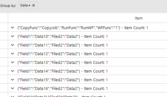 string test = String.Format("{0} - Item Count: {1}", value, _rowCount);Note that the curly brackets from the JSON are confusing since they participate in the place holders for the Format.String. The possible solution that I can suggest is to use the custom grouping approach. I have prepared a sample code snippet for your reference: