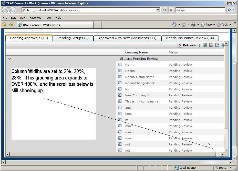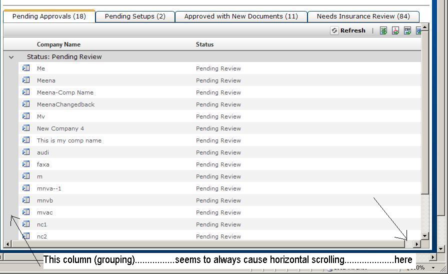 <telerik:RadTabStrip ID="WQTS" MultiPageID="WorkQueueTabPages" runat="server" Skin="Outlook" SelectedIndex="0"> <Tabs> <telerik:RadTab PageViewID="PendingApprovalsTabPage" runat="server" Text="Pending Approvals" Selected="True" Width="90%" /> <telerik:RadTab PageViewID="PendingSetupsTabPage" runat="server" Text="Pending Setups" /> <telerik:RadTab PageViewID="ApprovedNewDocsTabPage" runat="server" Text="Approved with New Documents" /> <telerik:RadTab PageViewID="NeedInsReviewTabPage" runat="server" Text="Needs Insurance Review" /> </Tabs> </telerik:RadTabStrip> <telerik:RadMultiPage runat="server" ID="WorkQueueTabPages" SelectedIndex="0"> <!-- Pending Approvals Tab --> <telerik:RadPageView ID="PendingApprovalsTabPage" runat="server"> <telerik:RadGrid Height="450px" AllowAutomaticInserts="false" AllowAutomaticDeletes="false" AllowAutomaticUpdates="false" ID="PendingApprovalsGrid" runat="server" AllowSorting="True" Width="90%" OnNeedDataSource="PendingApprovalsGrid_NeedDataSource" AutoGenerateColumns="False" OnItemCommand="OpenCompany" OnEditCommand="OpenCompany"> <ExportSettings HideStructureColumns="True" ExportOnlyData="True" IgnorePaging="True" OpenInNewWindow="True"> </ExportSettings> <FilterMenu EnableImageSprites="False"></FilterMenu> <HeaderContextMenu CssClass="GridContextMenu GridContextMenu_Default"></HeaderContextMenu> <ClientSettings AllowKeyboardNavigation = "True"> <Scrolling AllowScroll="True"></Scrolling> <ClientEvents OnRowCreated="workQueues_rowCreated" OnRowClick="workQueues_onRowClick" /> </ClientSettings> <mastertableview datakeynames="CompanyID" ClientDataKeyNames="CompanyId,CompanyName,VendorNumber" CommandItemDisplay="Top" > <GroupByExpressions> <telerik:GridGroupByExpression> <GroupByFields> <telerik:GridGroupByField FieldName="AccountStatusDesc" FieldAlias="Status" HeaderText="Status" FormatString="" /> </GroupByFields> <SelectFields> <telerik:GridGroupByField FieldName="AccountStatusDesc" FieldAlias="Status" FormatString="" HeaderText="Status" /> </SelectFields> </telerik:GridGroupByExpression> </GroupByExpressions> <Columns> <telerik:GridButtonColumn Text="Select" ButtonType="ImageButton" ImageUrl="~/images/select.bmp" CommandArgument="Select" Resizable="False" UniqueName="PendingApprovalsViewCol" FilterControlAltText="Filter PendingApprovalsViewCol column"> <ItemStyle Width="2%" /> </telerik:GridButtonColumn> <telerik:GridBoundColumn DataField="CompanyName" FilterControlAltText="Filter CompanyName column" ItemStyle-Width="40%" HeaderText="Company Name" HeaderTooltip="Sort by Company Name" UniqueName="CompanyName"> </telerik:GridBoundColumn> <telerik:GridBoundColumn DataField="AccountStatusDesc" FilterControlAltText="Filter AccountStatusDesc column" ItemStyle-Width="58%" HeaderText="Status" HeaderTooltip="Sort by Status" UniqueName="AccountStatusDesc"> </telerik:GridBoundColumn> <telerik:GridBoundColumn DataField="VendorNumber" FilterControlAltText="Filter VendorNumber column" UniqueName="VendorNumber" Visible="False"> </telerik:GridBoundColumn> </Columns> <EditFormSettings> <EditColumn FilterControlAltText="Filter EditCommandColumn column"> </EditColumn> </EditFormSettings> <ExpandCollapseColumn FilterControlAltText="Filter ExpandColumn column"> </ExpandCollapseColumn> <RowIndicatorColumn FilterControlAltText="Filter RowIndicator column"> </RowIndicatorColumn> <CommandItemSettings ShowExportToPdfButton="True" ShowExportToWordButton="True" ShowExportToExcelButton="True" ShowExportToCsvButton="True" ShowAddNewRecordButton="False" /> </mastertableview> <GroupPanel> <PanelItemsStyle BorderStyle="Solid" BorderWidth="1px" GridLines="Both" /> </GroupPanel> </telerik:RadGrid> </telerik:RadPageView> (next 3 tabs ommitted)