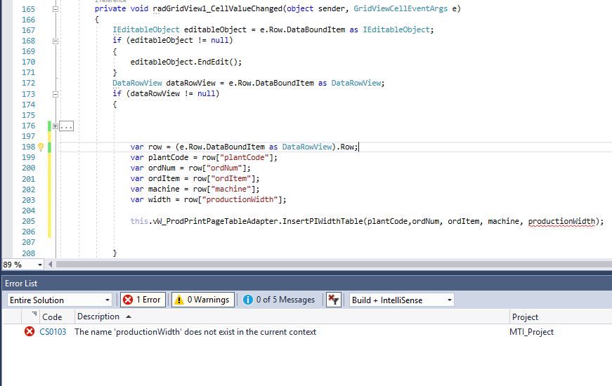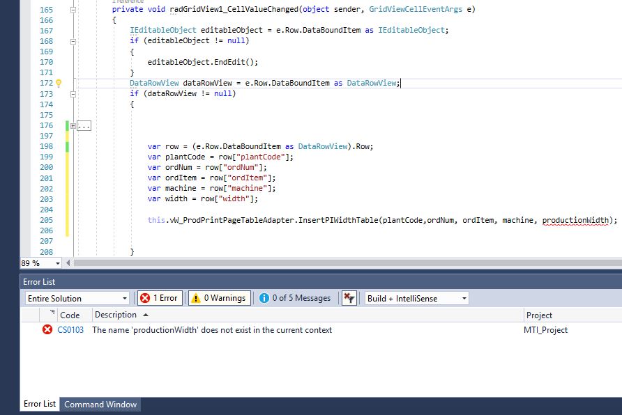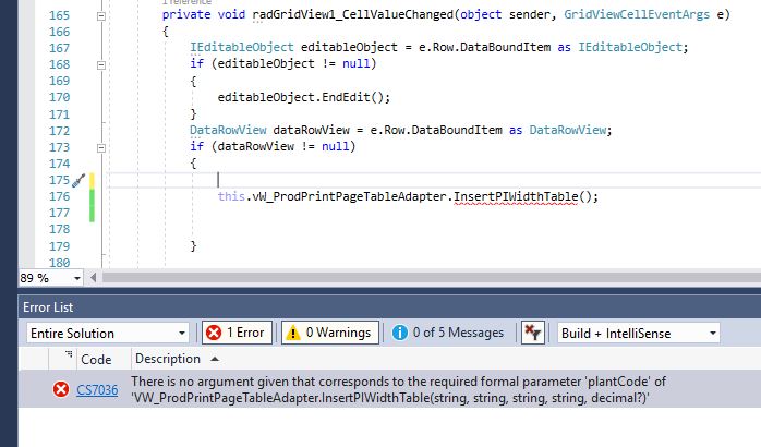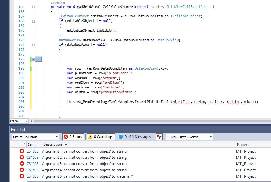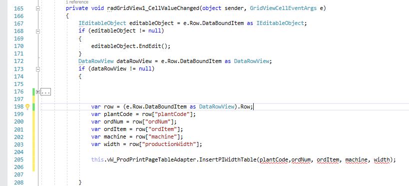 private void RadGridView1_CellEndEdit(object sender, GridViewCellEventArgs e){ var row = (e.Row.DataBoundItem as DataRowView).Row; var plantCode = row["PlantColumn"]; var orNum = row["OrNum"]; InsertPIWithTable(plantCode, orNum);}Let me know how this works for you.