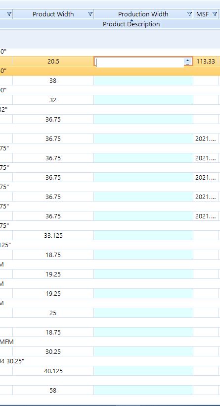 in the gridview that column name is changed to "productionWidth" and binds to the field "width" in the table. (we have 2 different types of width showing in the gridview which is why I had to change the name)