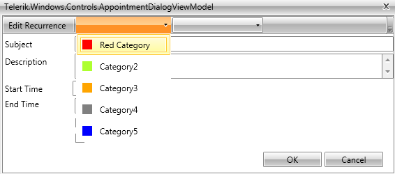 <telerik:RadComboBox ItemsSource="{Binding Categories}" SelectedItem="{Binding Occurrence.Appointment.Category, Mode=TwoWay}" Width="136" MinHeight="22" BorderThickness="0" HorizontalContentAlignment="Left" DisplayMemberPath="CategoryName"> <telerik:RadComboBox.ItemTemplate> <DataTemplate> <telerik:RadMenuItem> <telerik:RadMenuItem.Header> <TextBlock Text="{Binding CategoryName}"></TextBlock> </telerik:RadMenuItem.Header> <telerik:RadMenuItem.Icon> <Rectangle Width="14" Height="14" HorizontalAlignment="Left" VerticalAlignment="Center" Fill="{Binding CategoryBrush}" /> </telerik:RadMenuItem.Icon> </telerik:RadMenuItem> </DataTemplate> </telerik:RadComboBox.ItemTemplate></telerik:RadComboBox>
